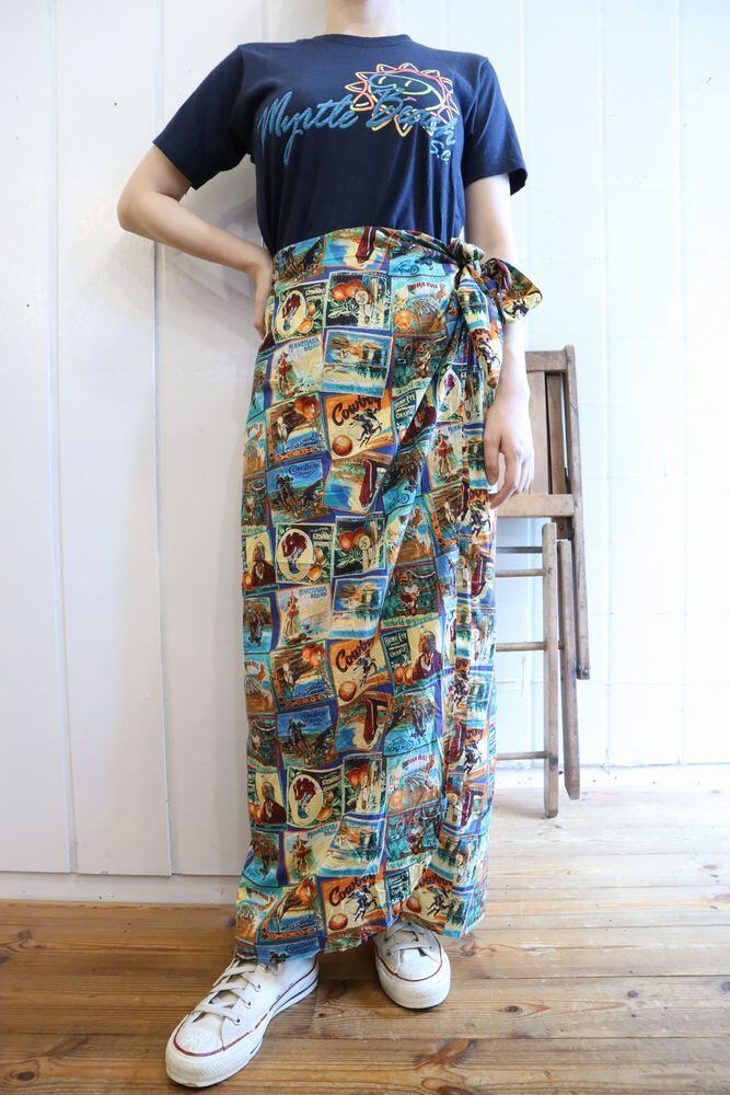 オレンジの広告のようなプリントが可愛いラップスカート。