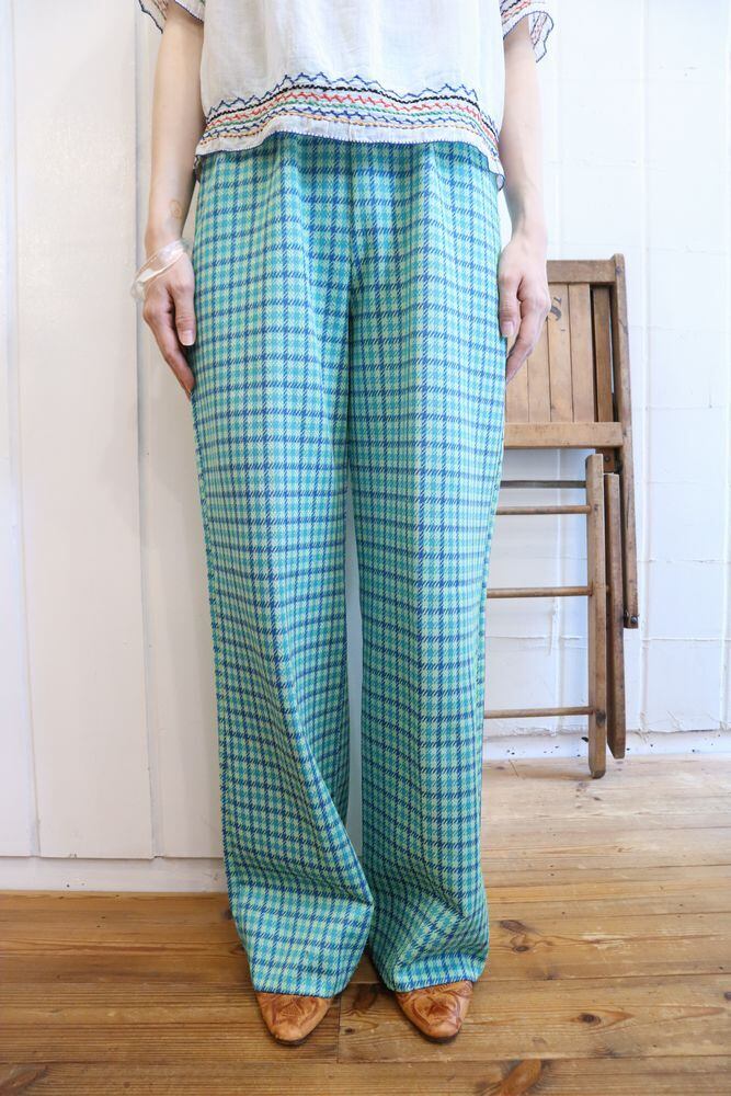 70s lightgreen×blue plaid polyester easy pants [l-926]