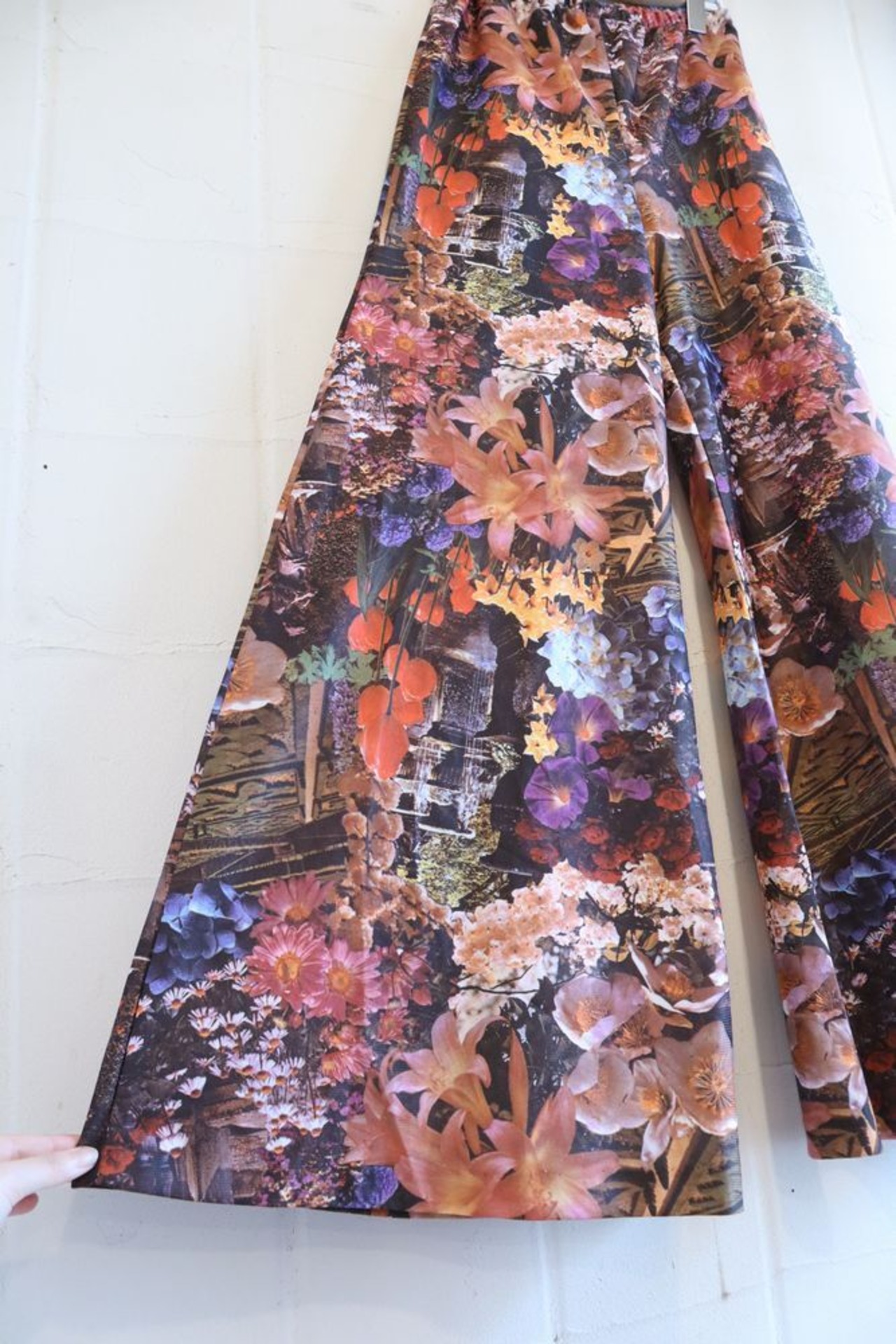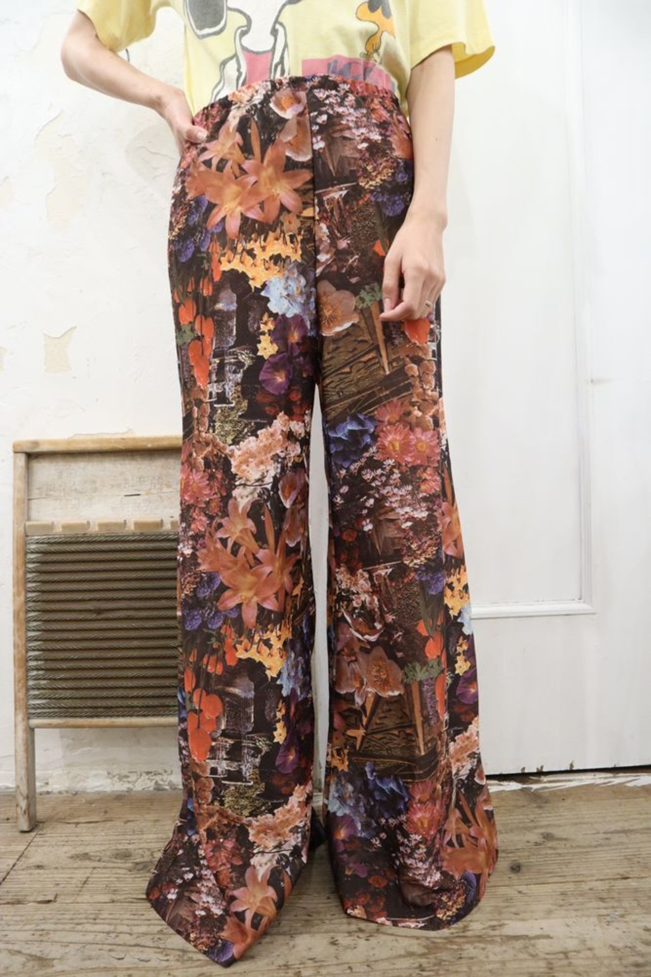 70s darkbrown×colorful photo print polyester super wide pants [l-929]