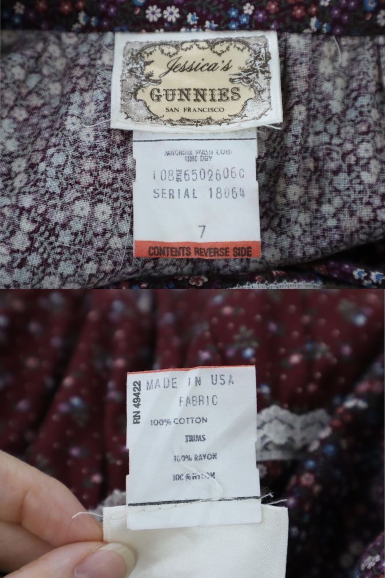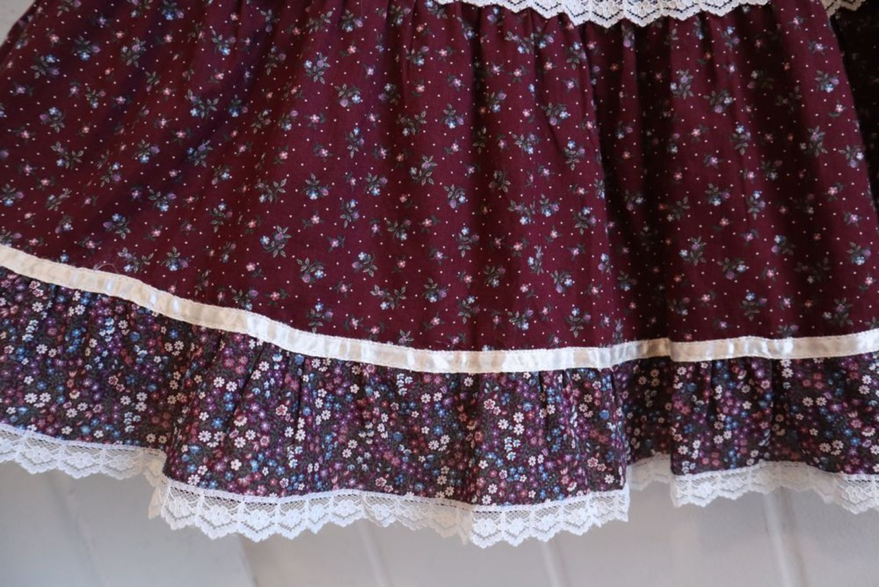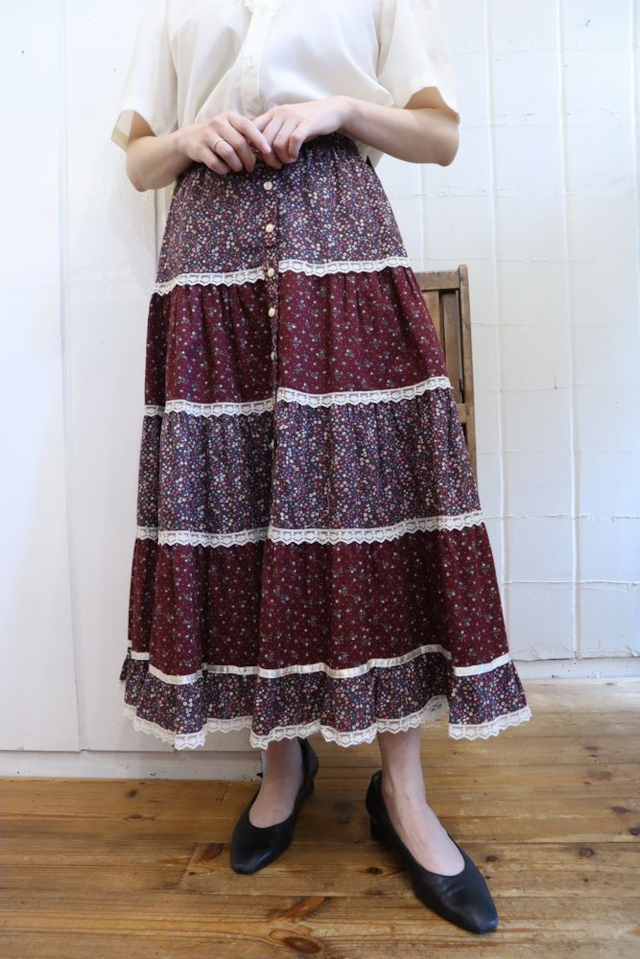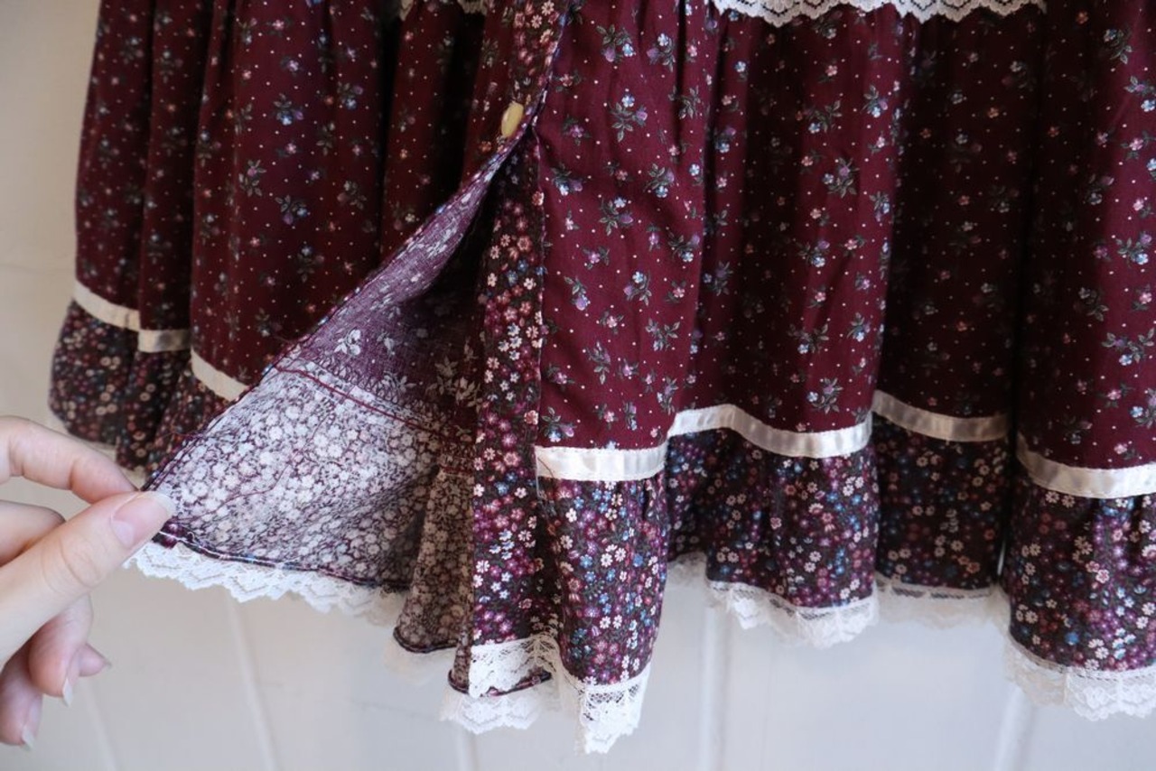 70s "GUNNE SAX" wine × white front button flower tiered skirt [l-934]