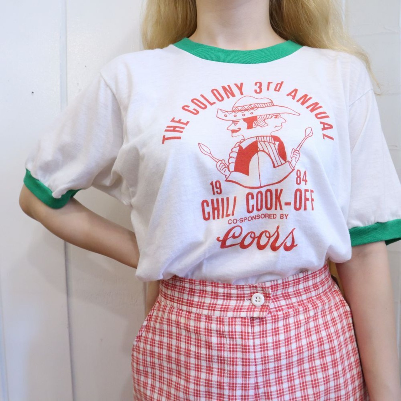80s white × red × green Mexican print ringer T-shirt [l-937]