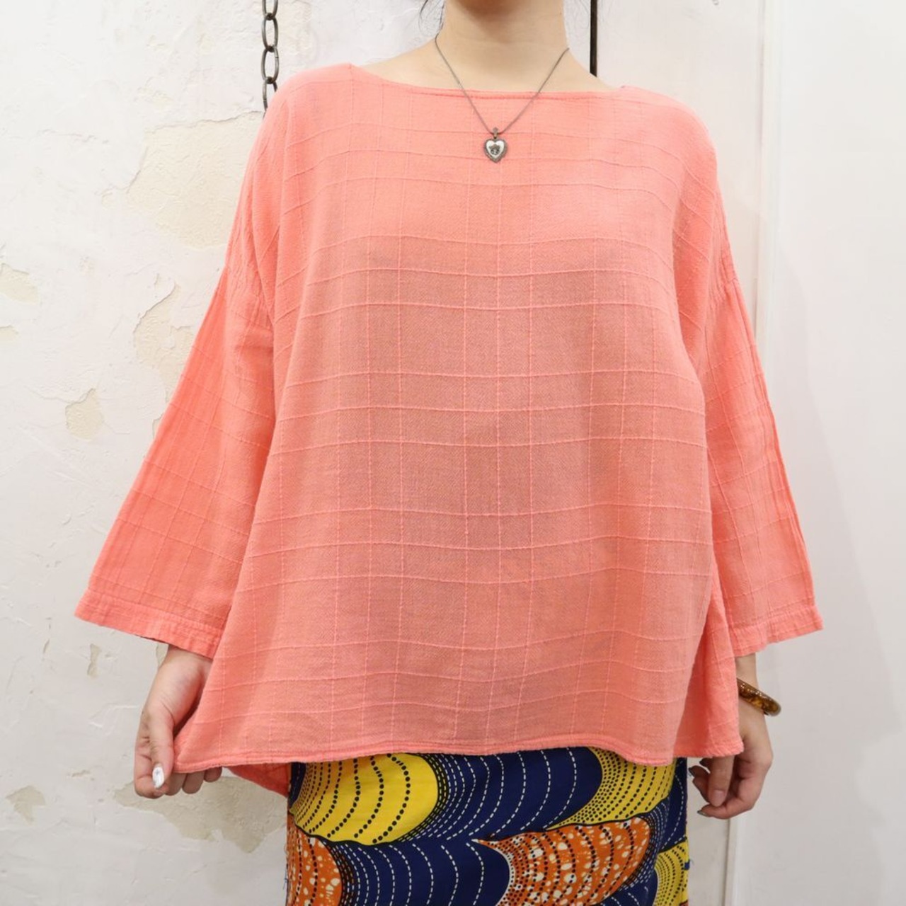 サーモンピンクカラーが可愛いトップス。