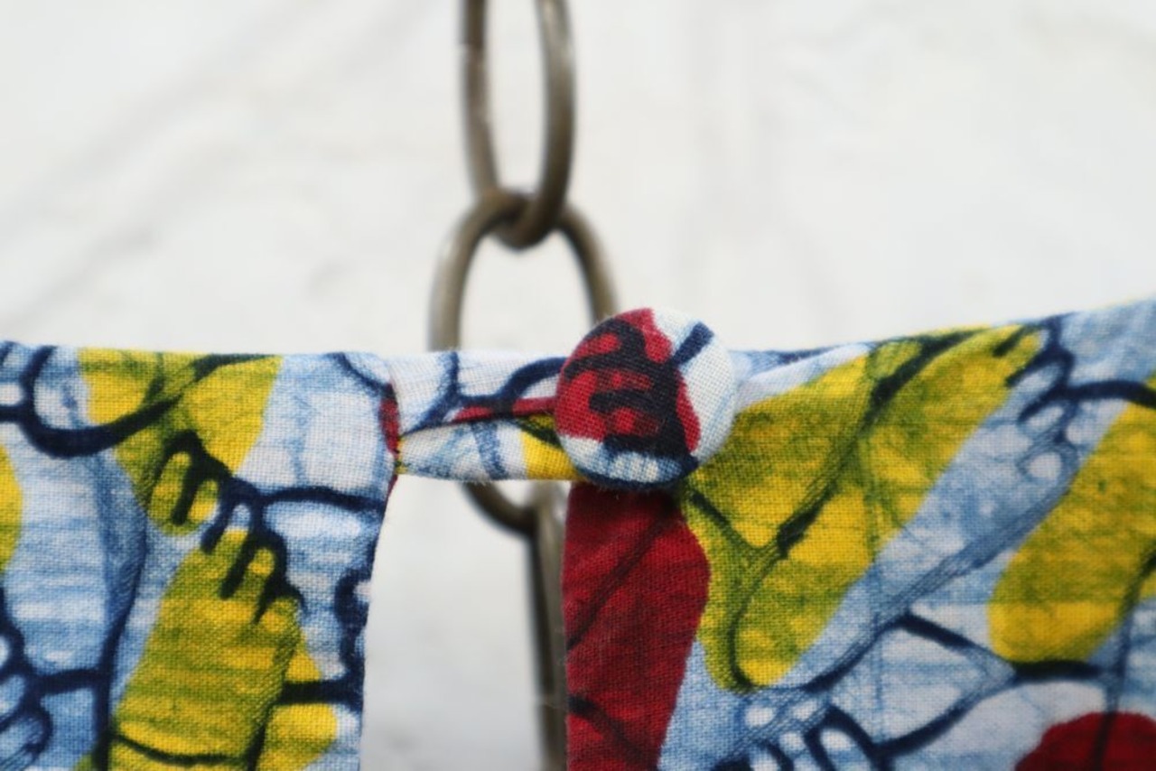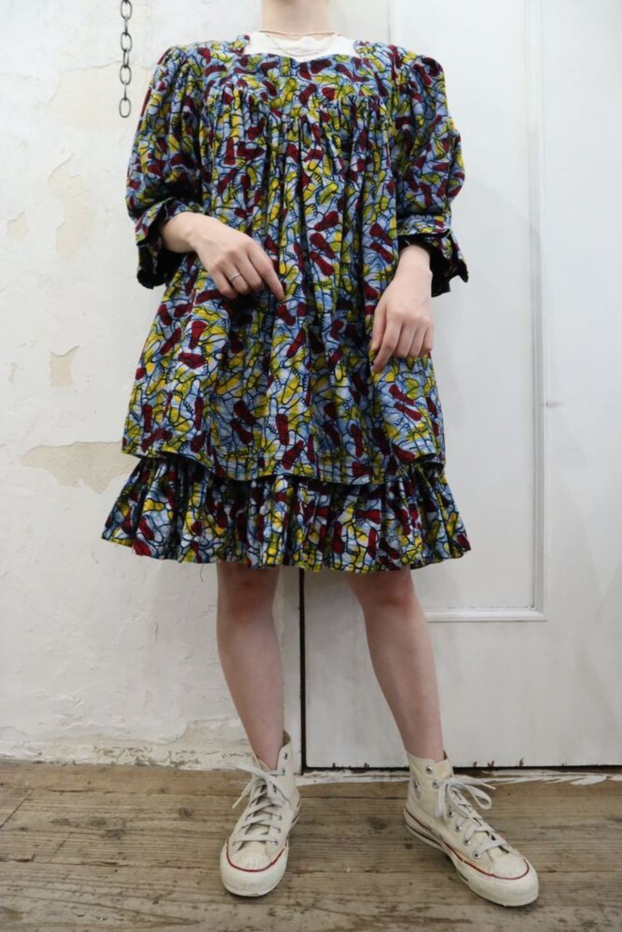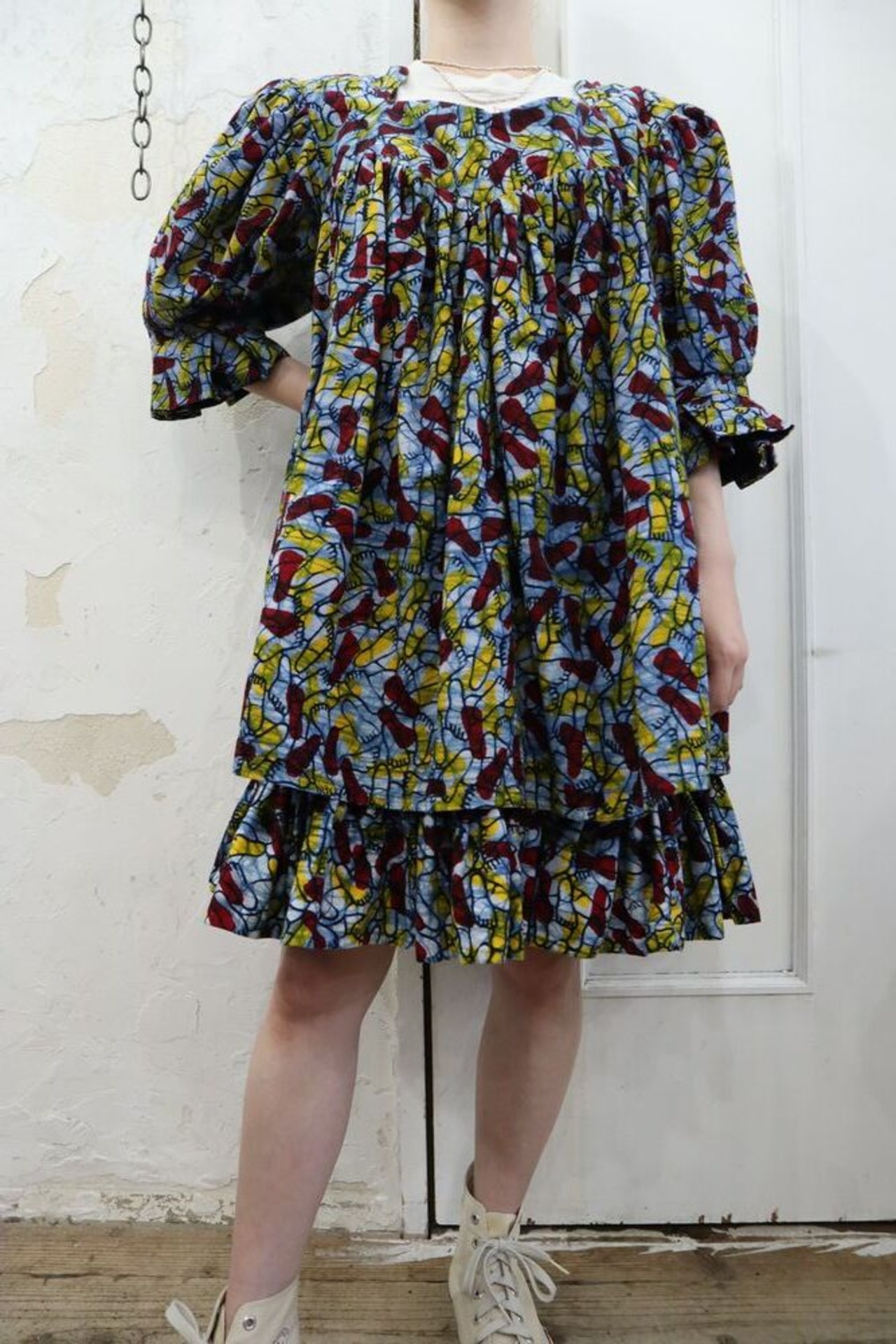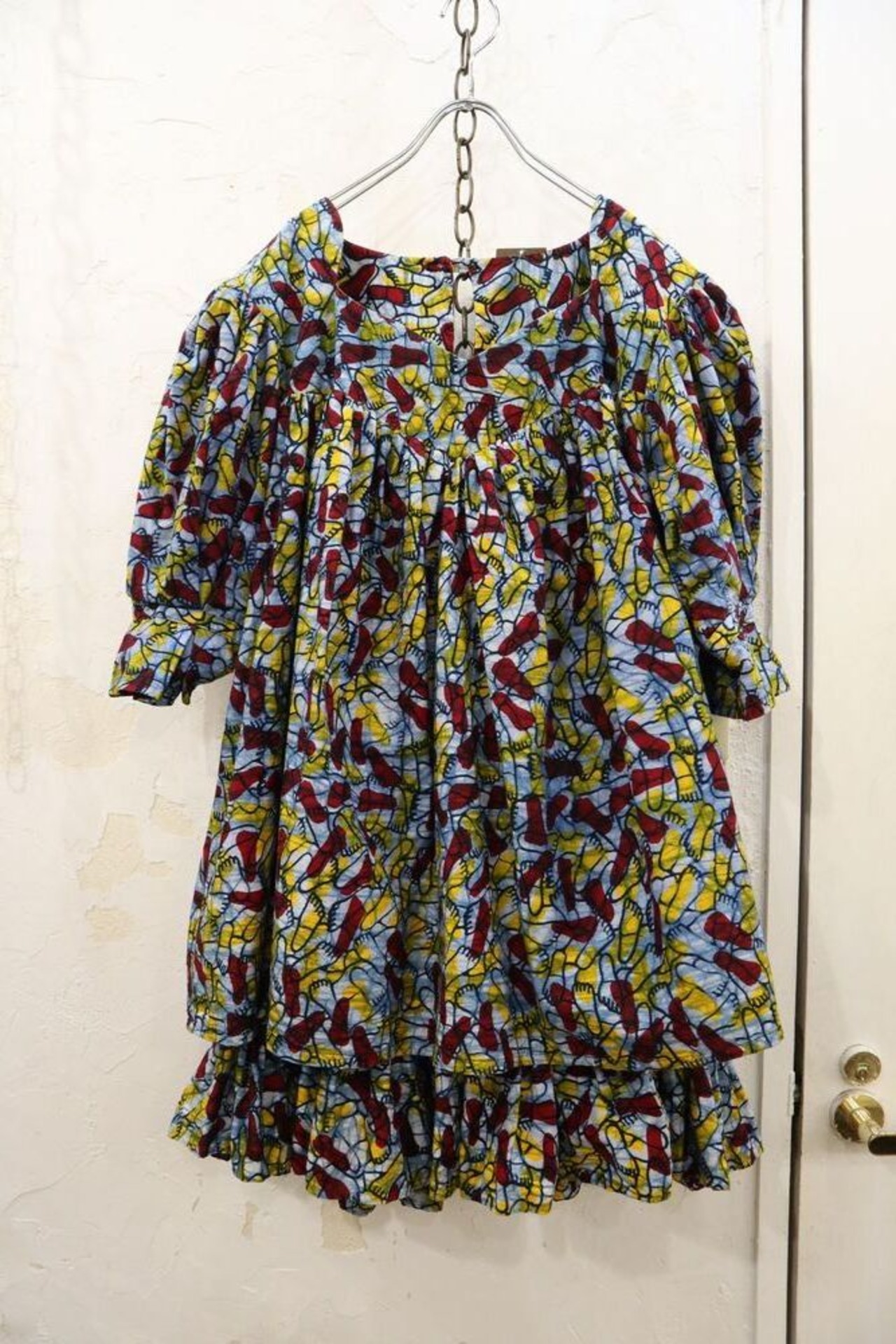 blue×yellow×red puff sleeve african batik short dress [k-947]