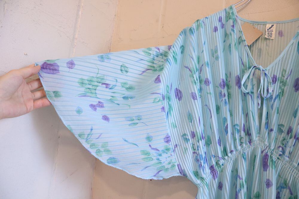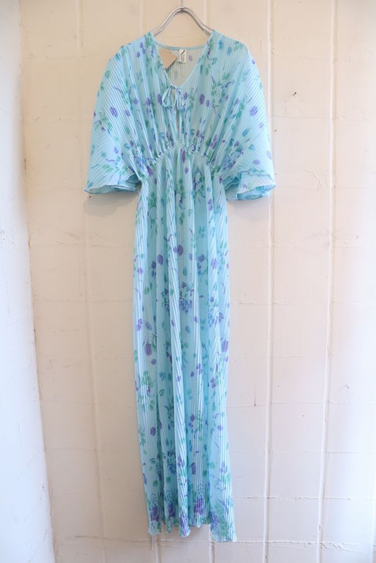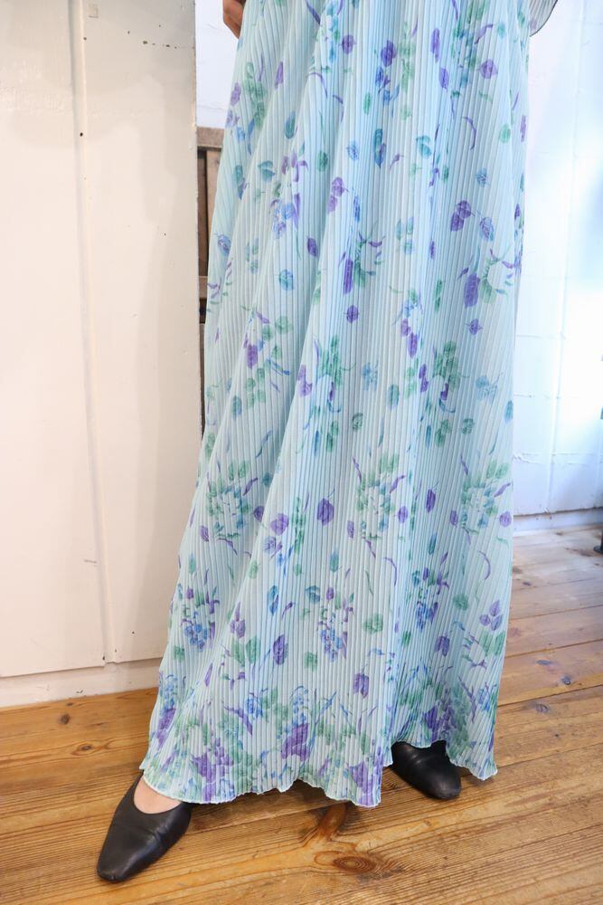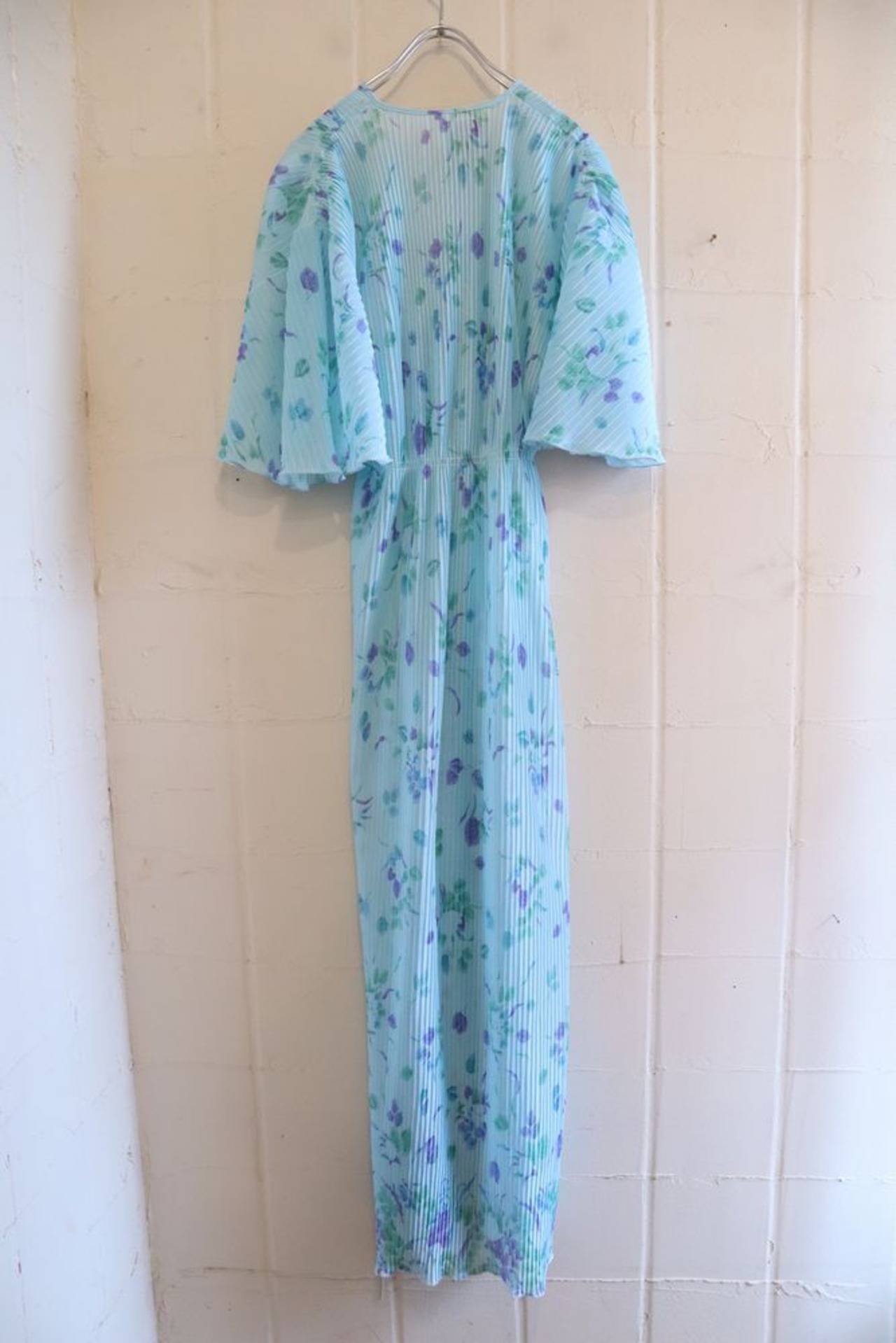 70s- lightblue×purple flower pattern pleats see-through dress [l-963]