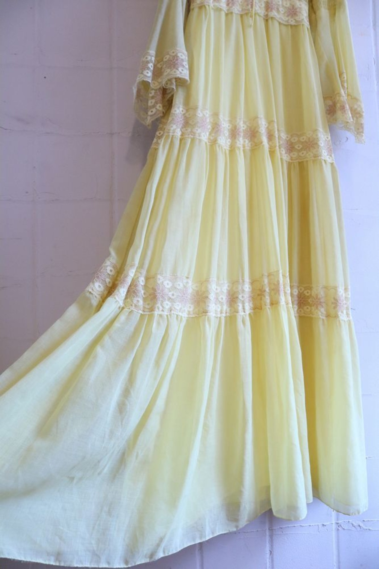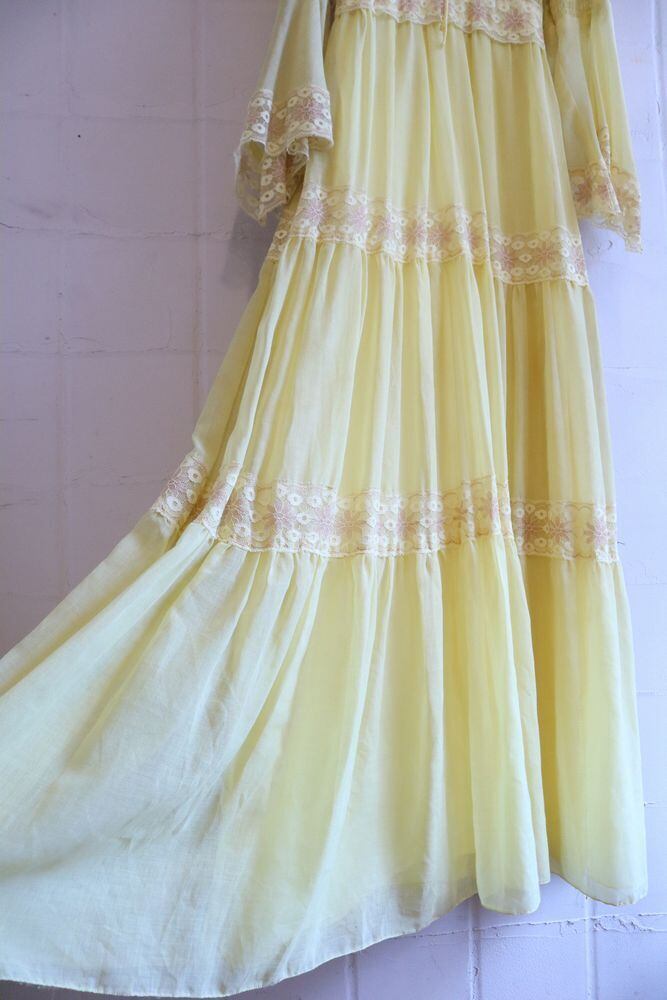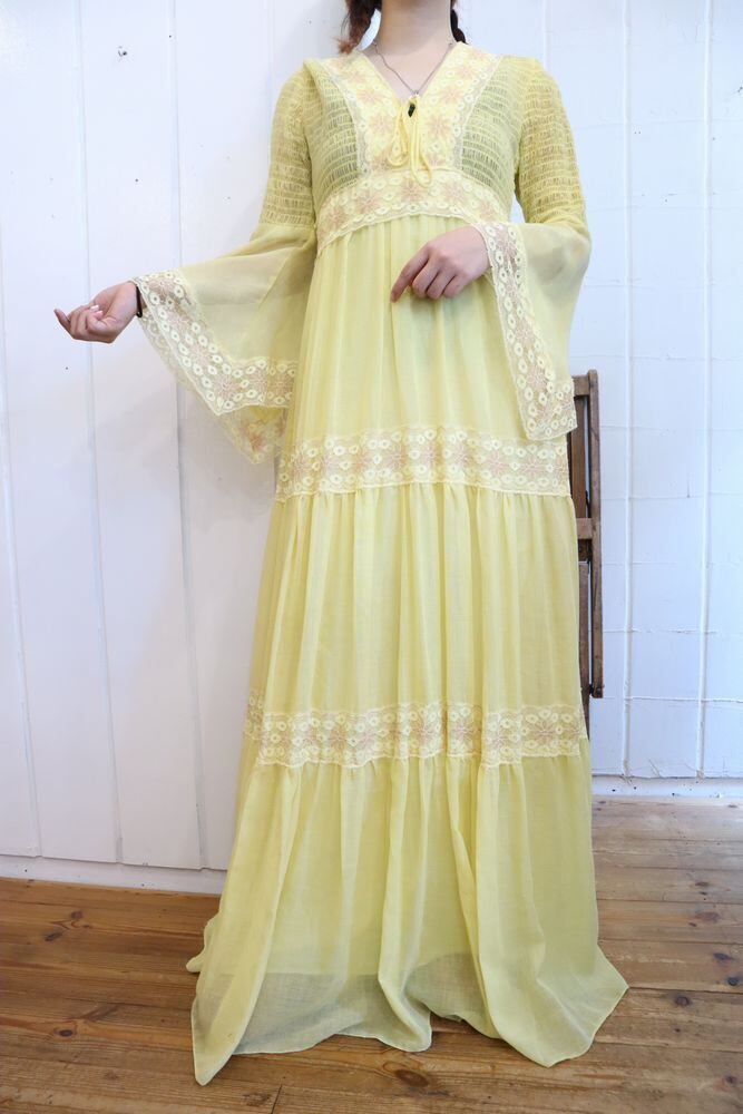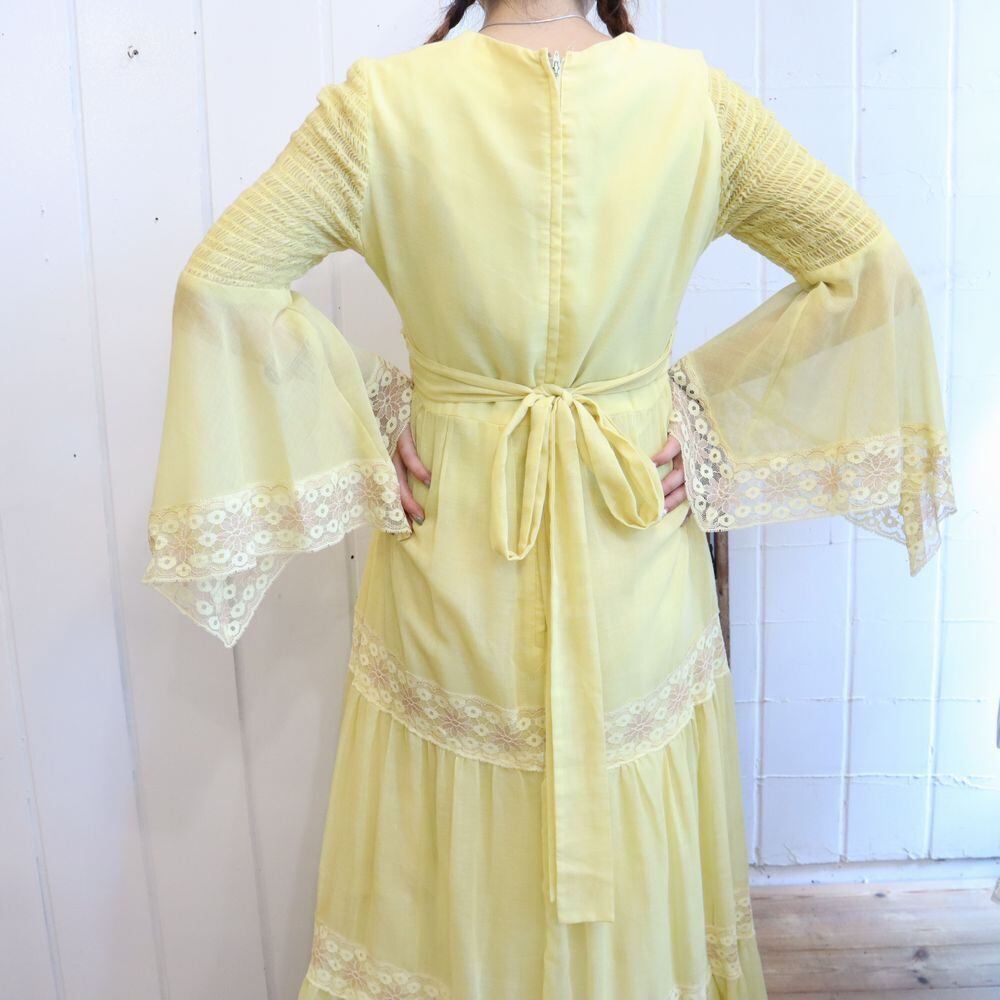70s lightyellow×beige bell sleeve long dress [l-965]
