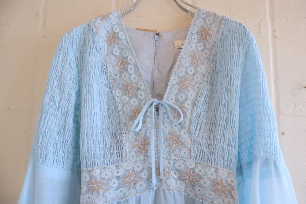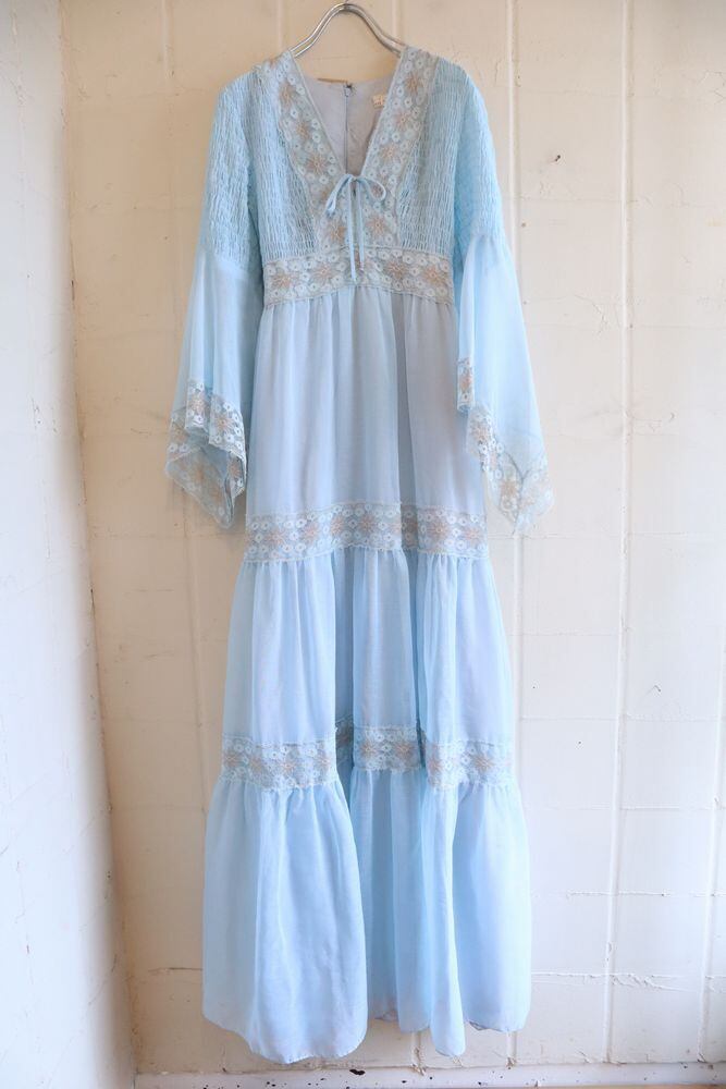 70s lightblue×beige bell sleeve long dress [l-966]