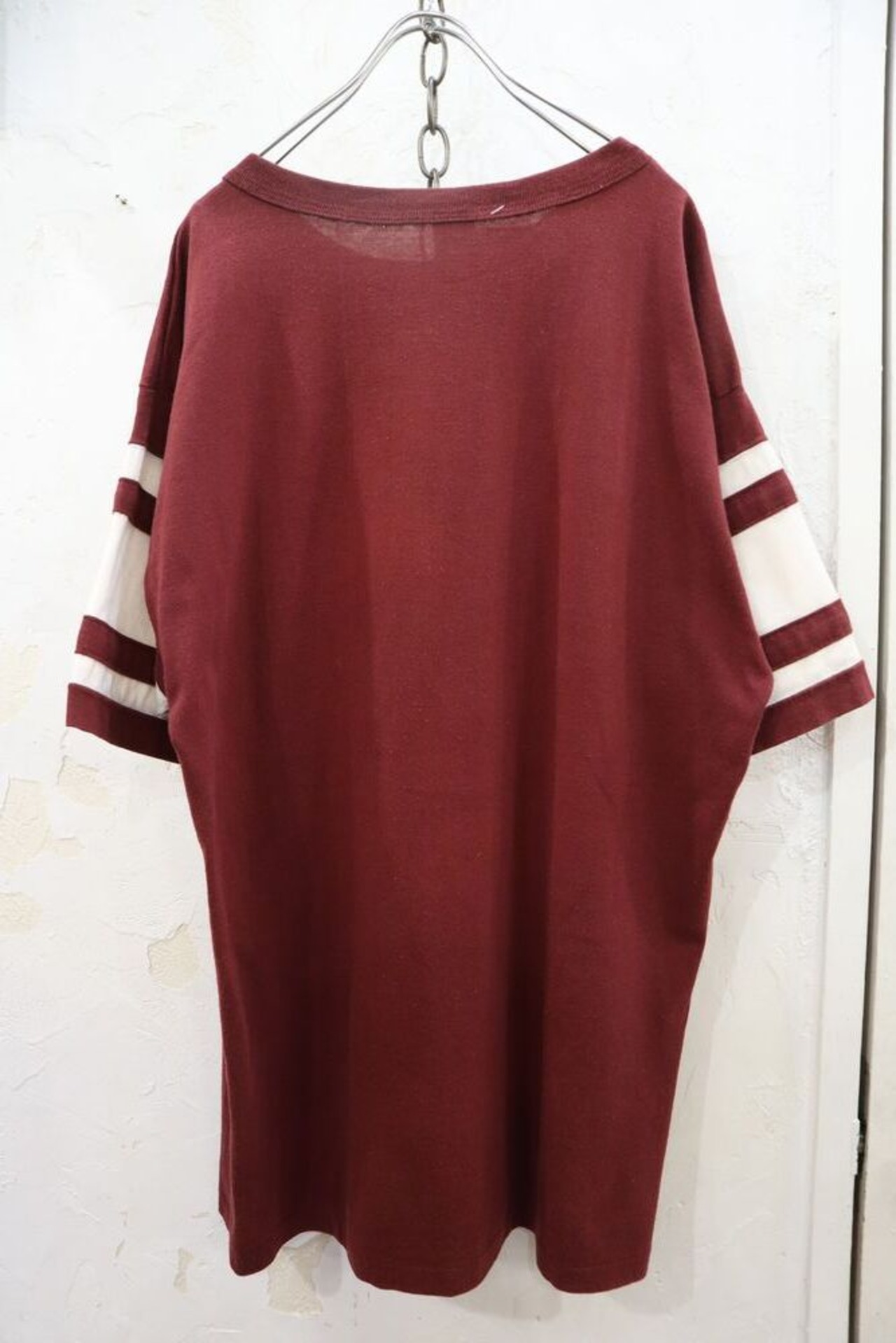 80s bordeaux×white×yellow rubber print football T-shirt [k-985]