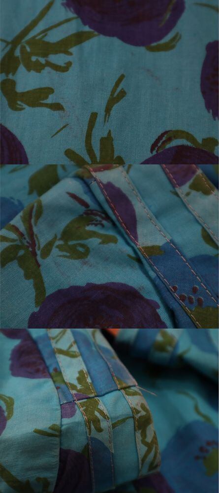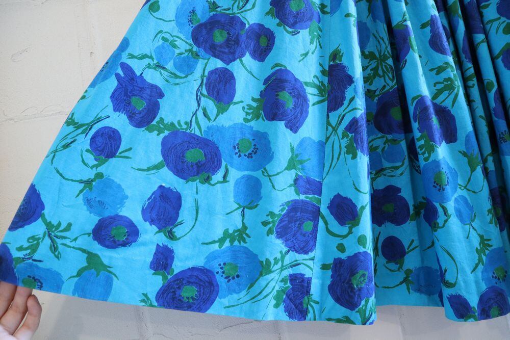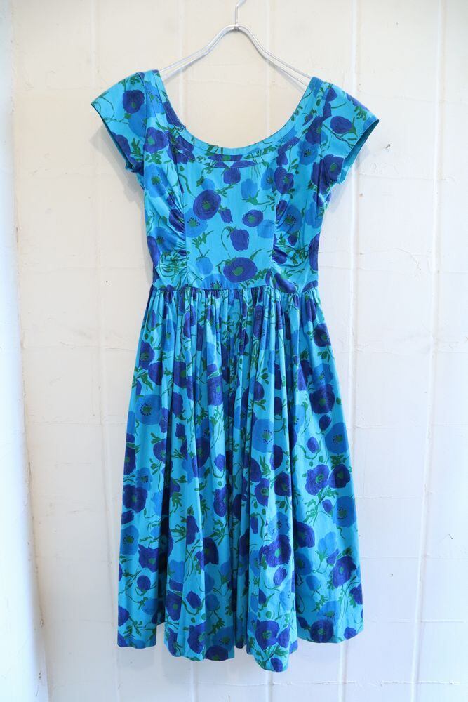 50-60s lightblue×blue flower pattern round neck dress [l-1008]