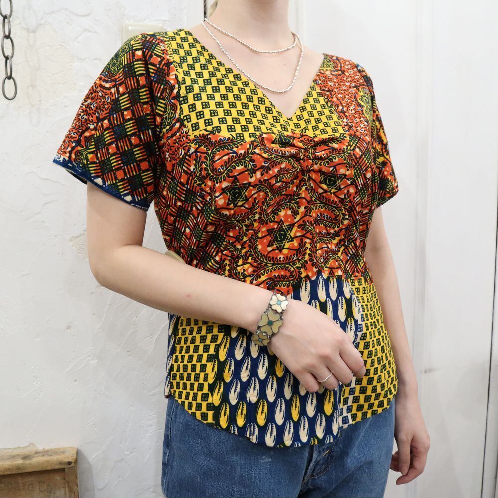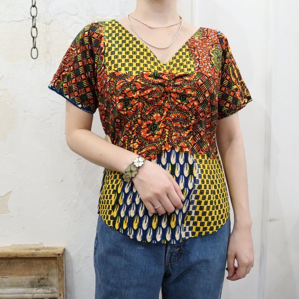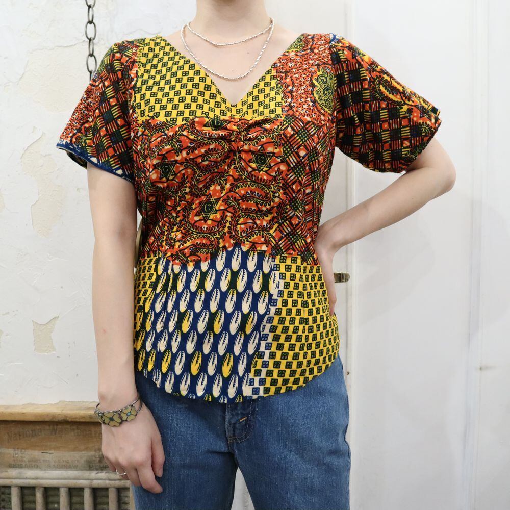 orange×yellow×blue african batik short sleeve tops [k-1021]