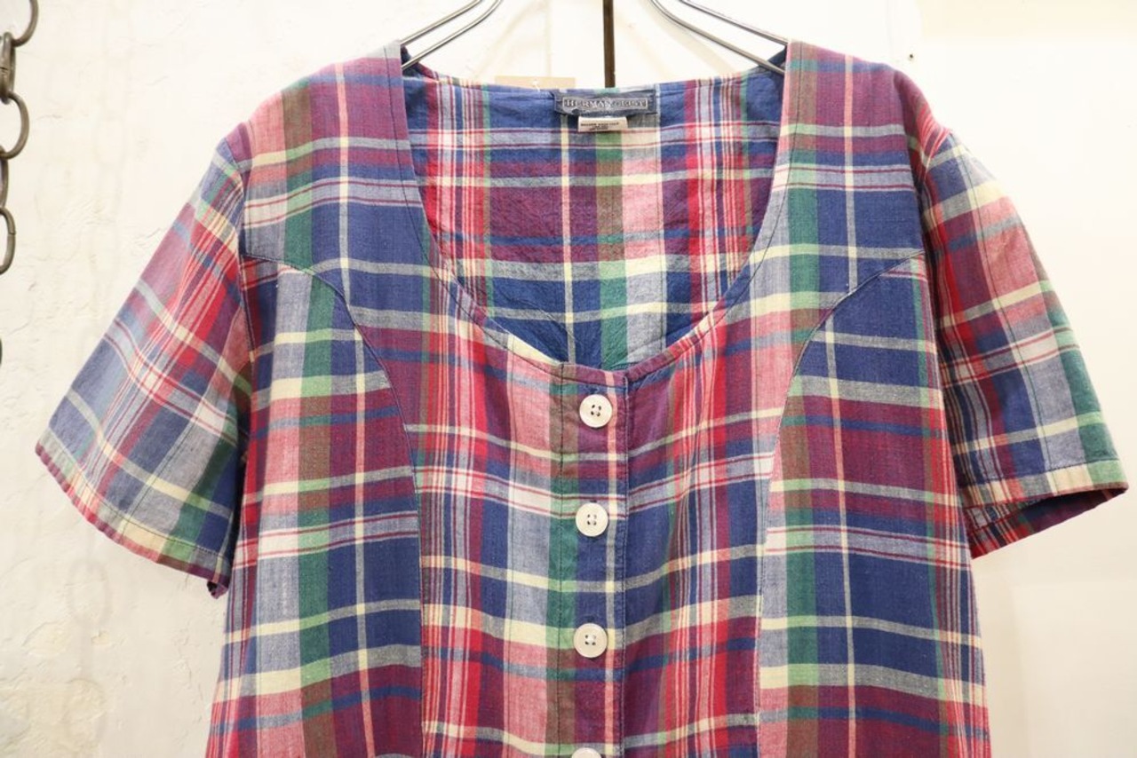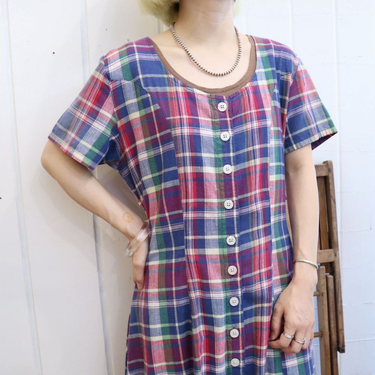 blue×purple×colorful plaid pattern short sleeve India cotton dress [l-1028]