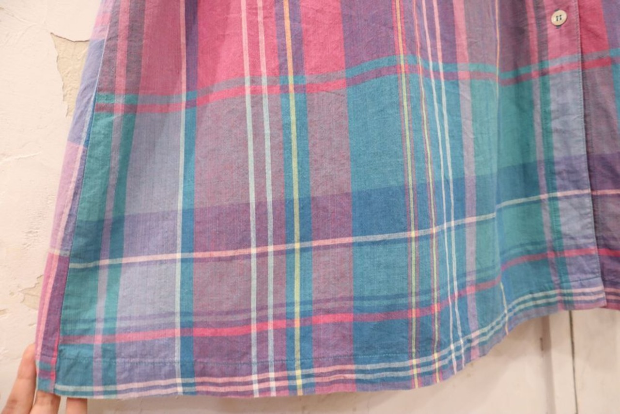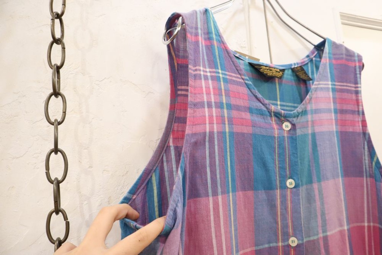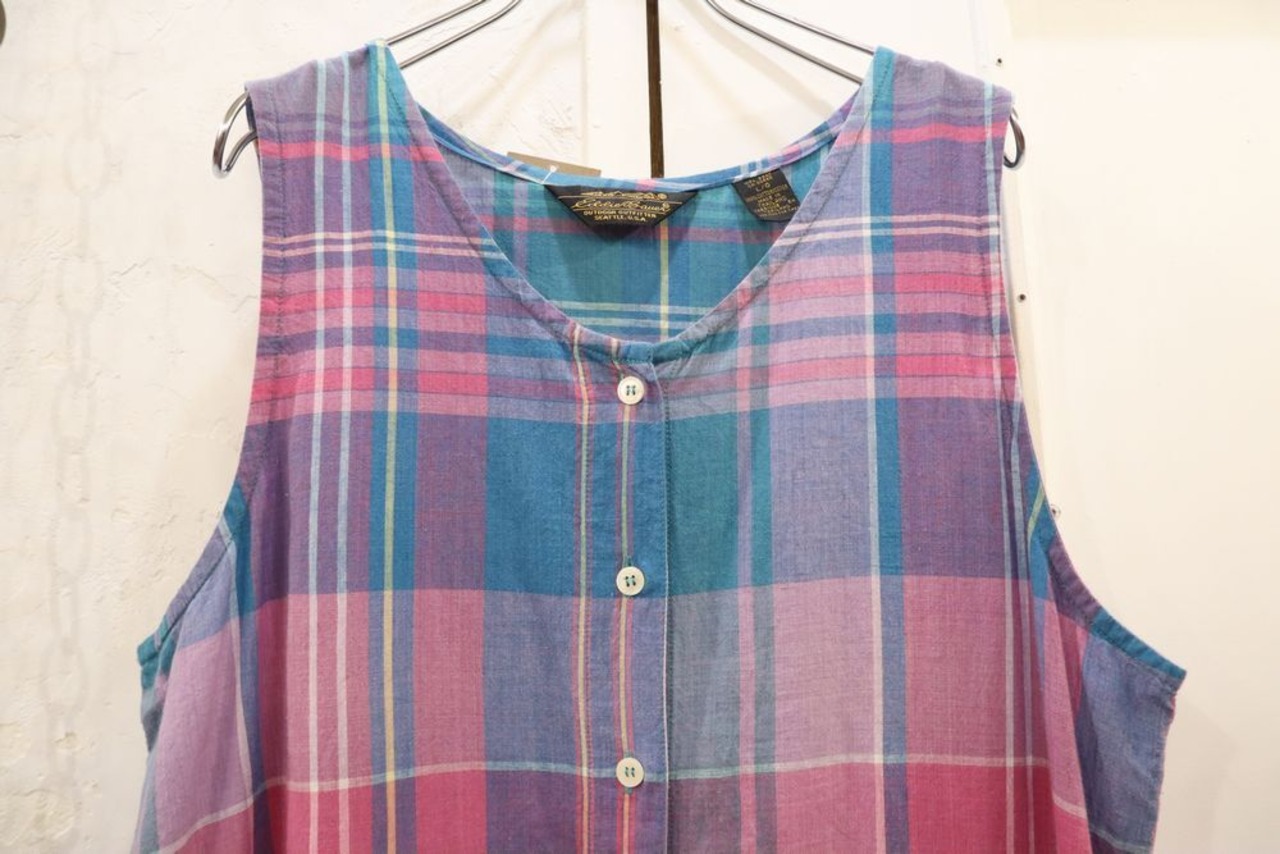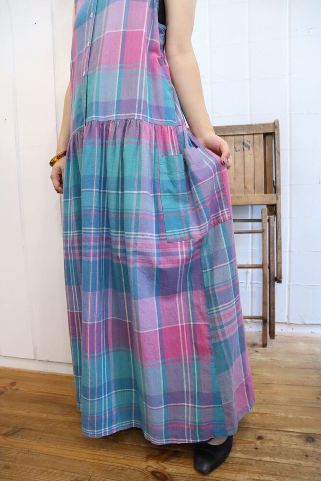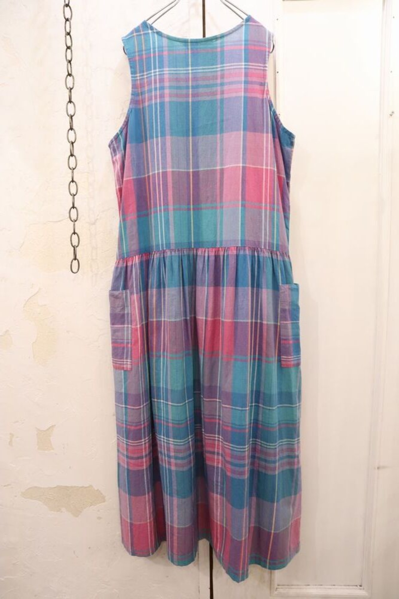 80-90s blue×pink×green plaid pattern sleevelass cotton dress [l-1029]