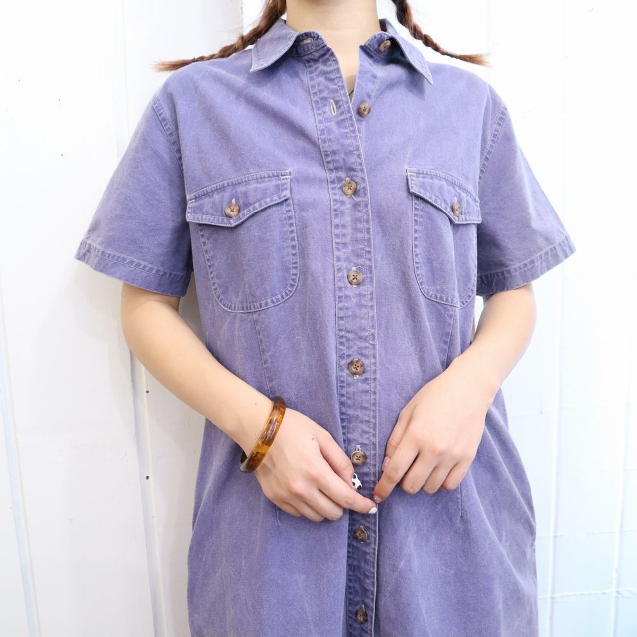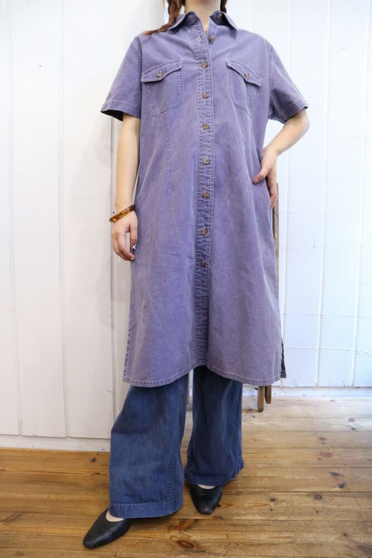 70-80s purple plain short sleeve cotton dress [l-1032]