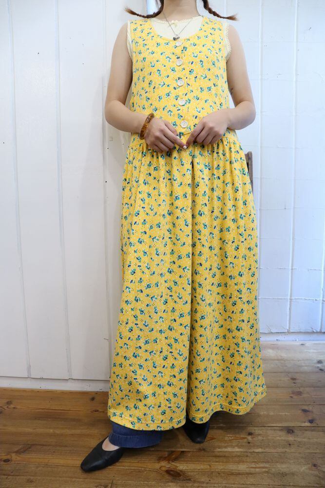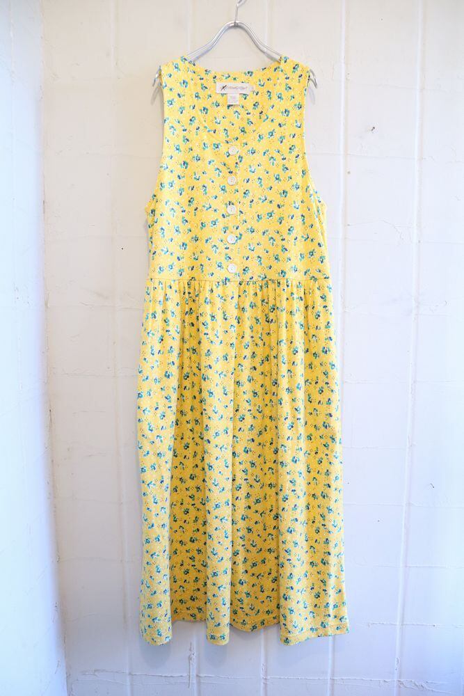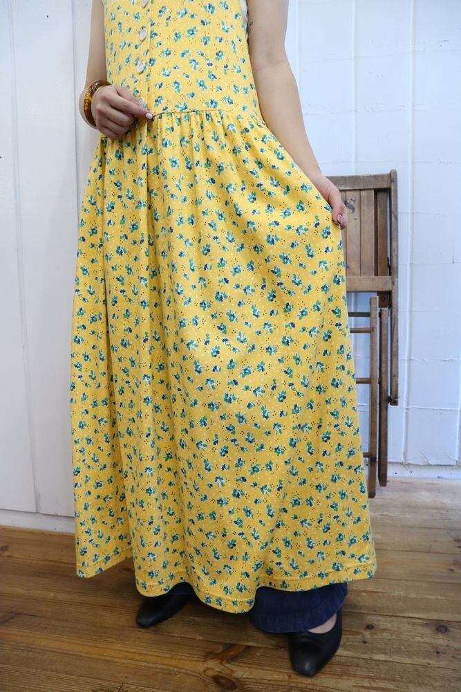 yellow×green flower pattern sleeveless dress [l-1036]