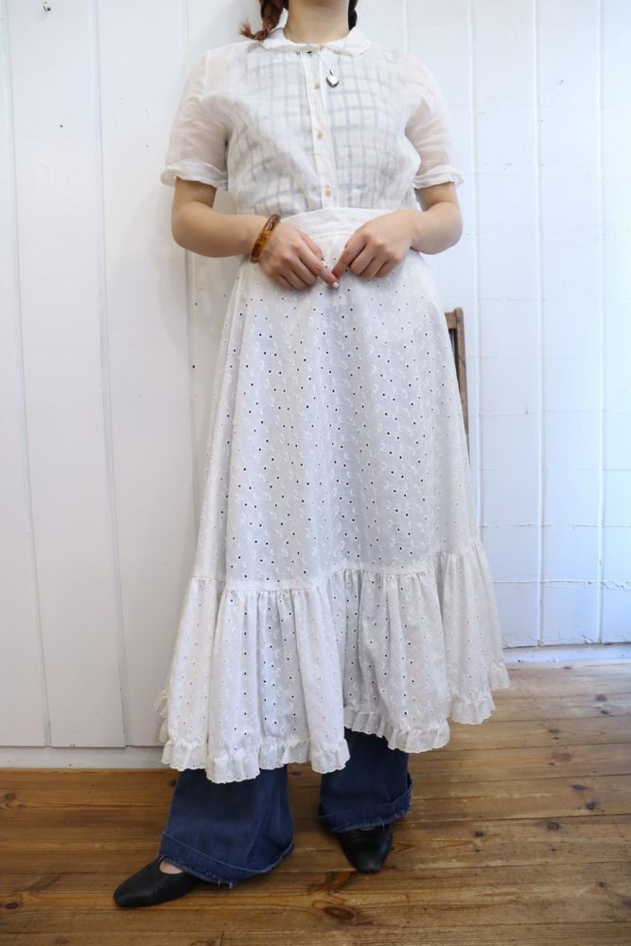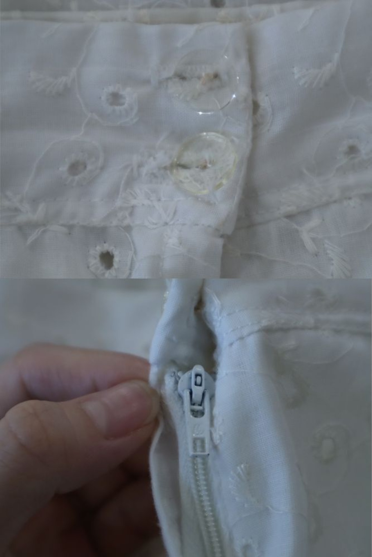 いくつかシミ、裾に点ほどの小穴、刺繍のレースにホツレが見受けられますが、古着の味として着て頂けるかと思われます。