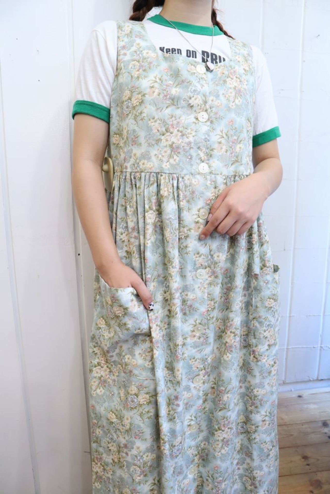ウエストから少し広がったシルエットや、大き目のポケットも可愛いポイントです◎