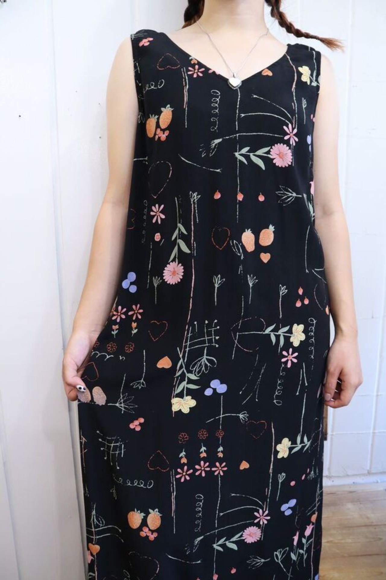 black×colorful flower& pattern sleeveless rayon dress [k-1105]