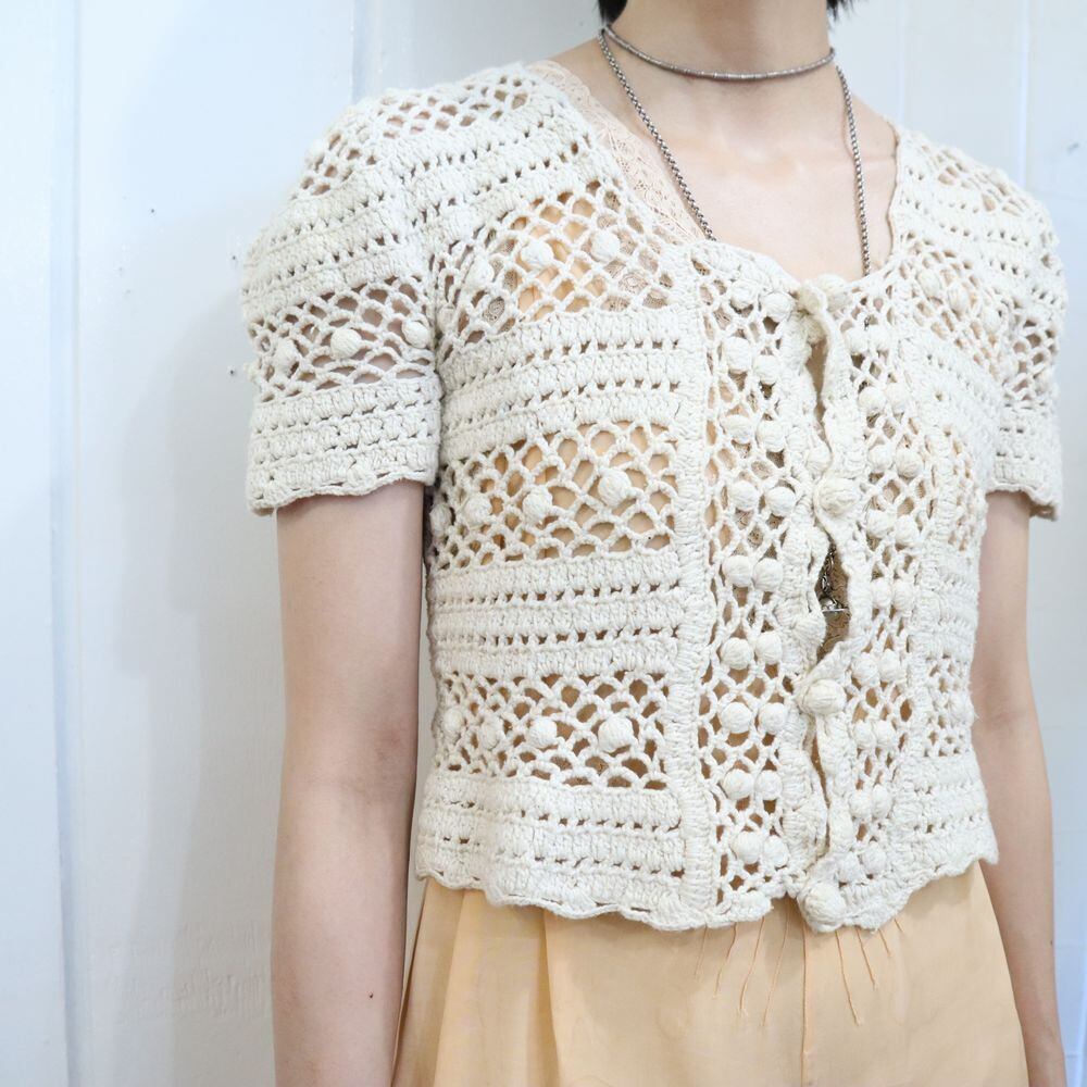 コンパクトなサイズ感が可愛いかぎ編みカーディガンです。