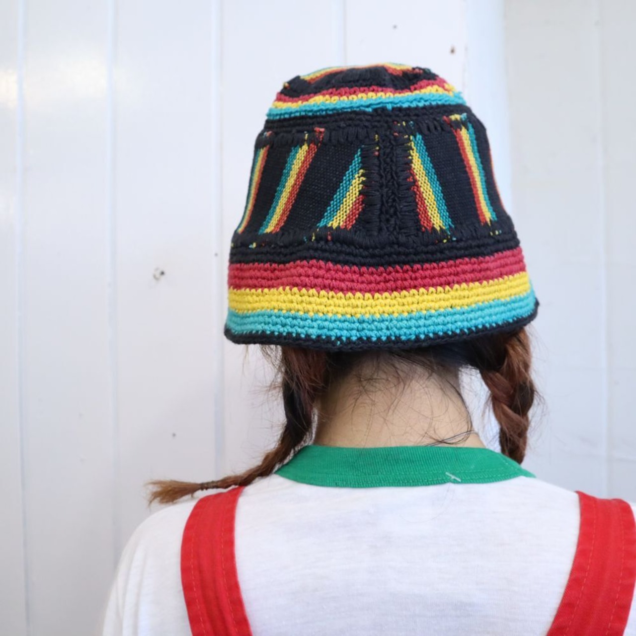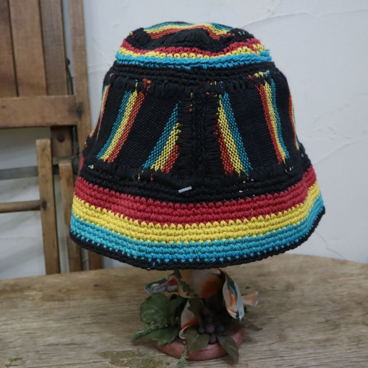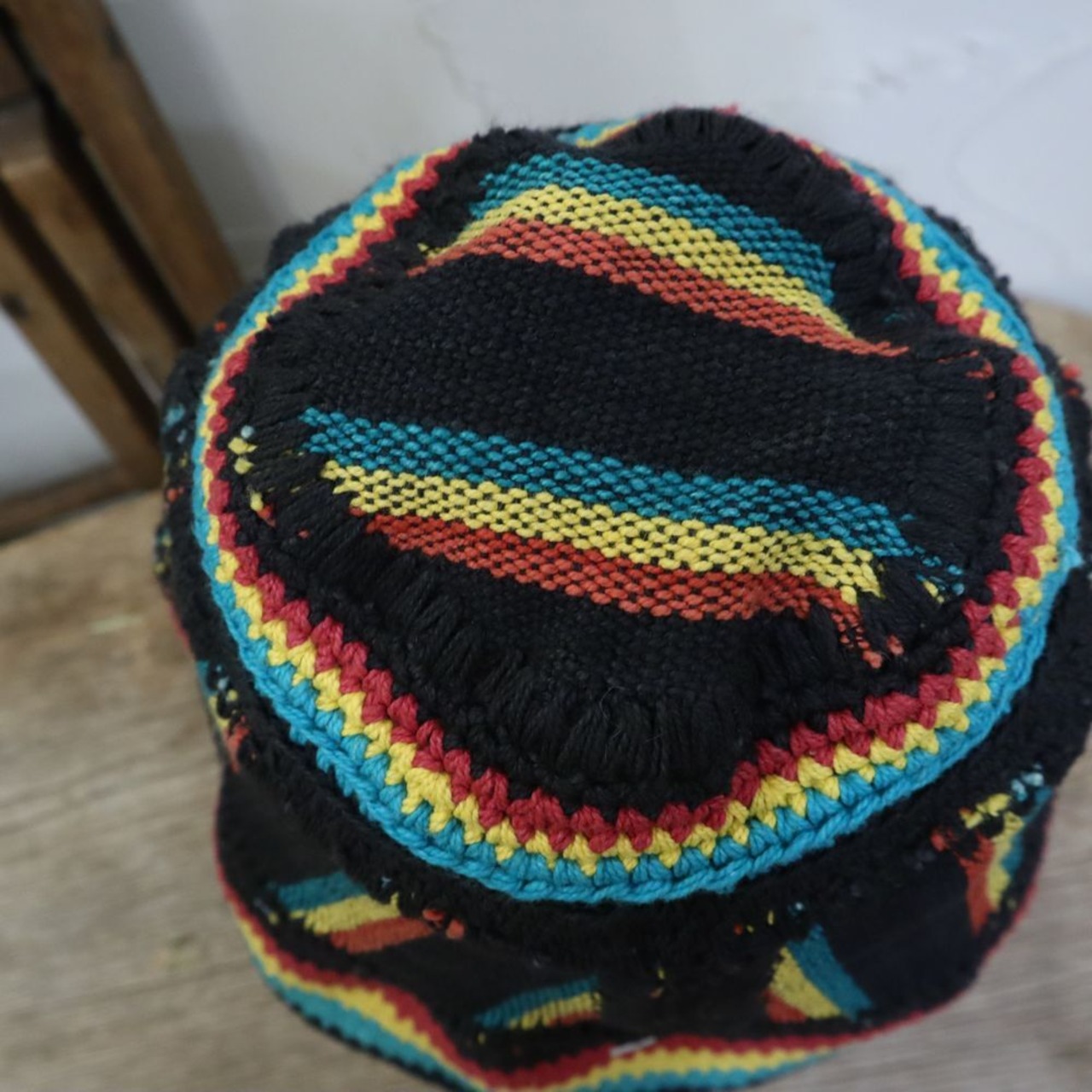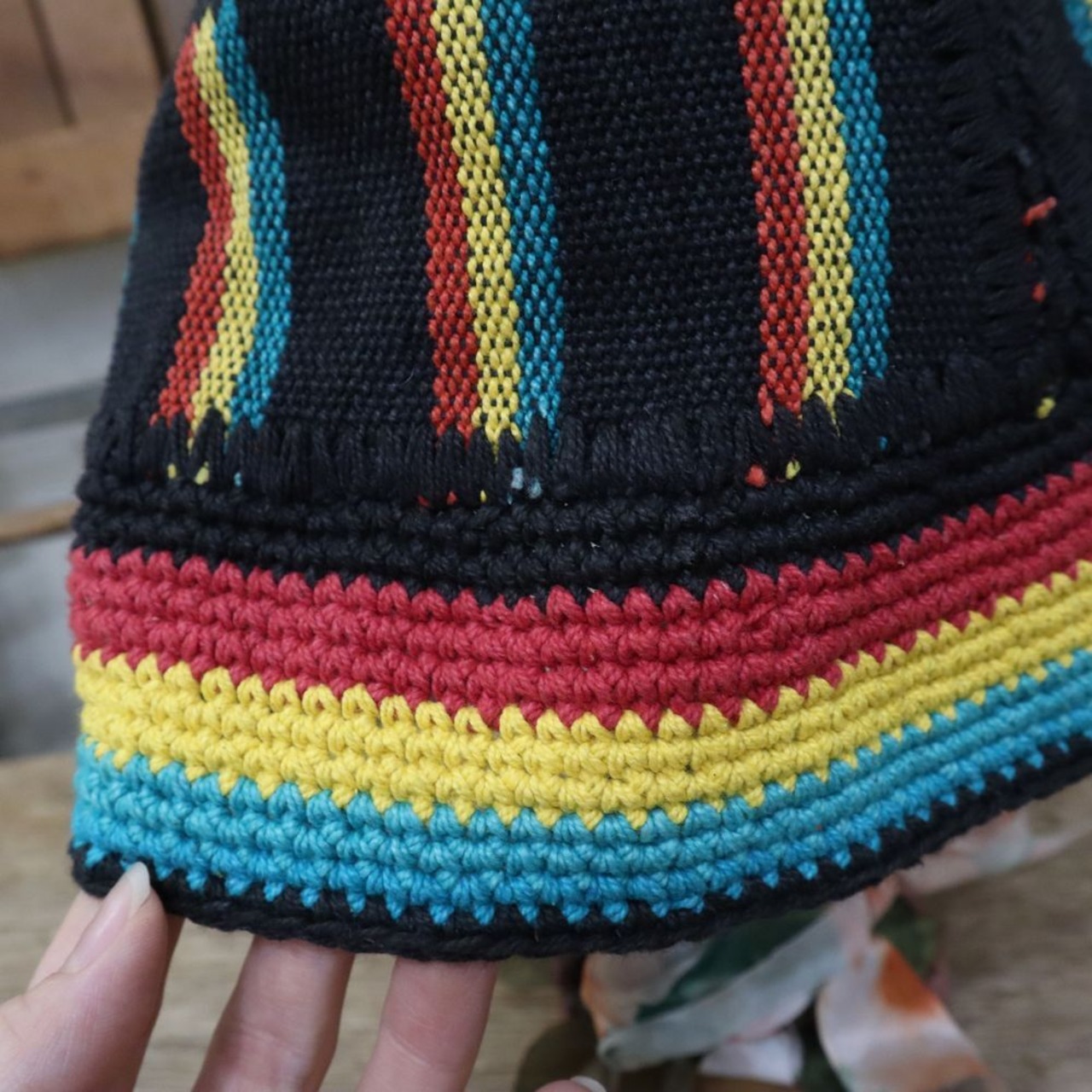 赤黄緑のラスタカラーとブラックの組み合わせが可愛い帽子です。