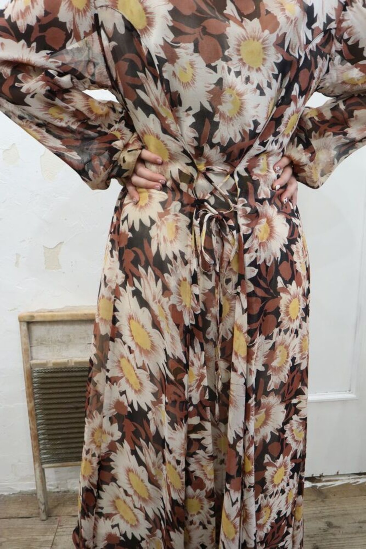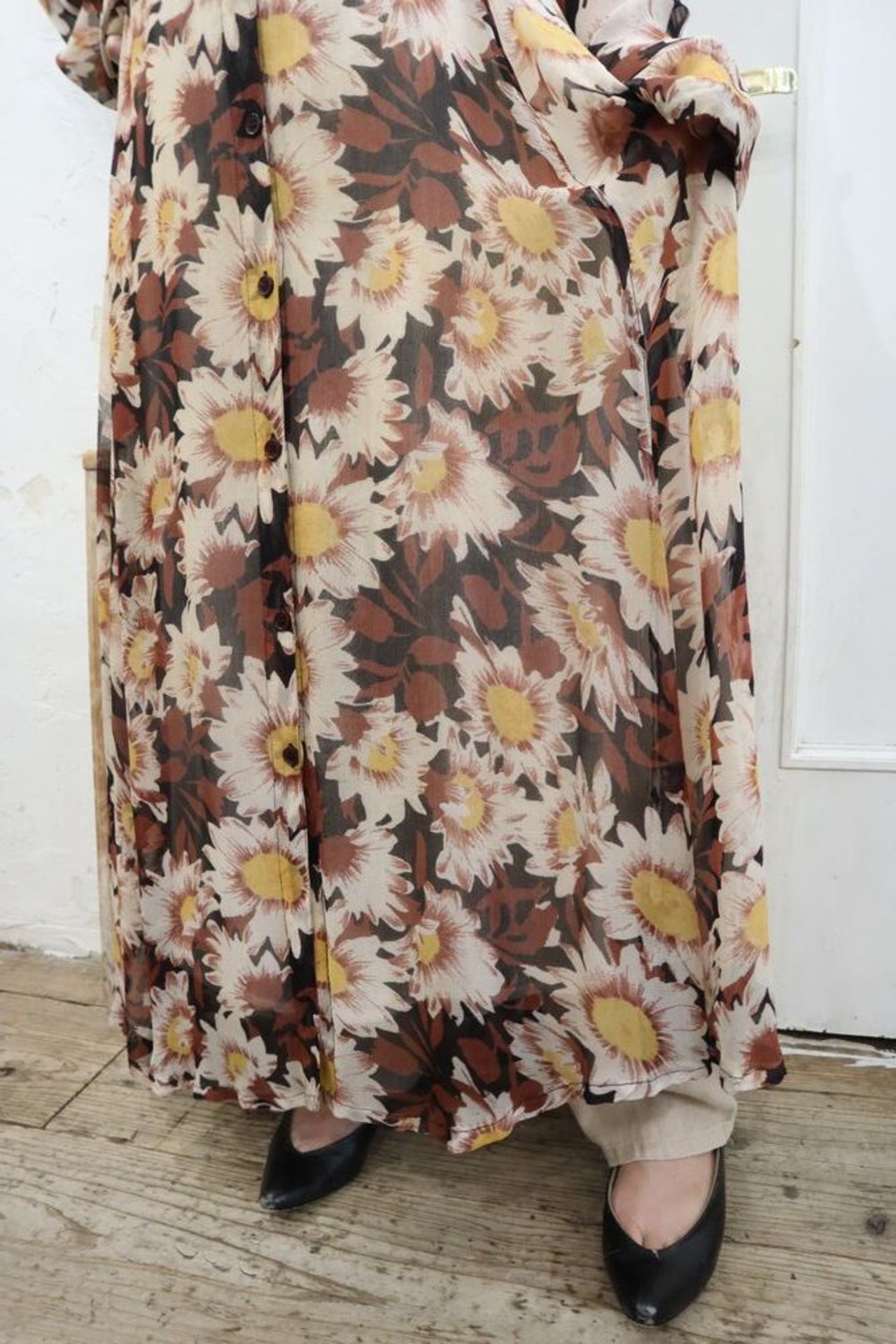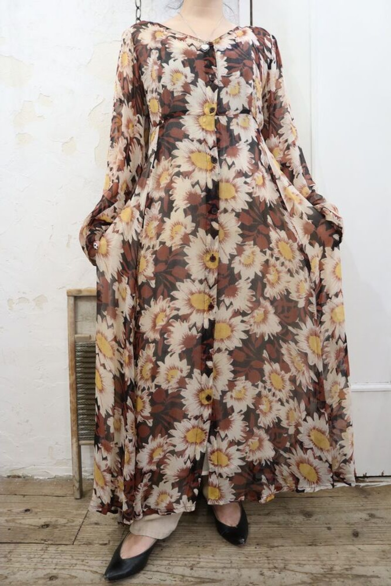 70s brown×black×yellow flower long sleeve dress [k-1150]
