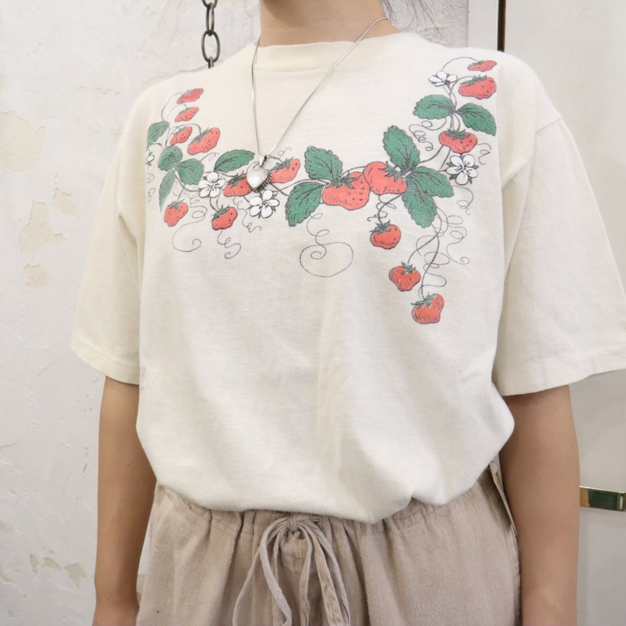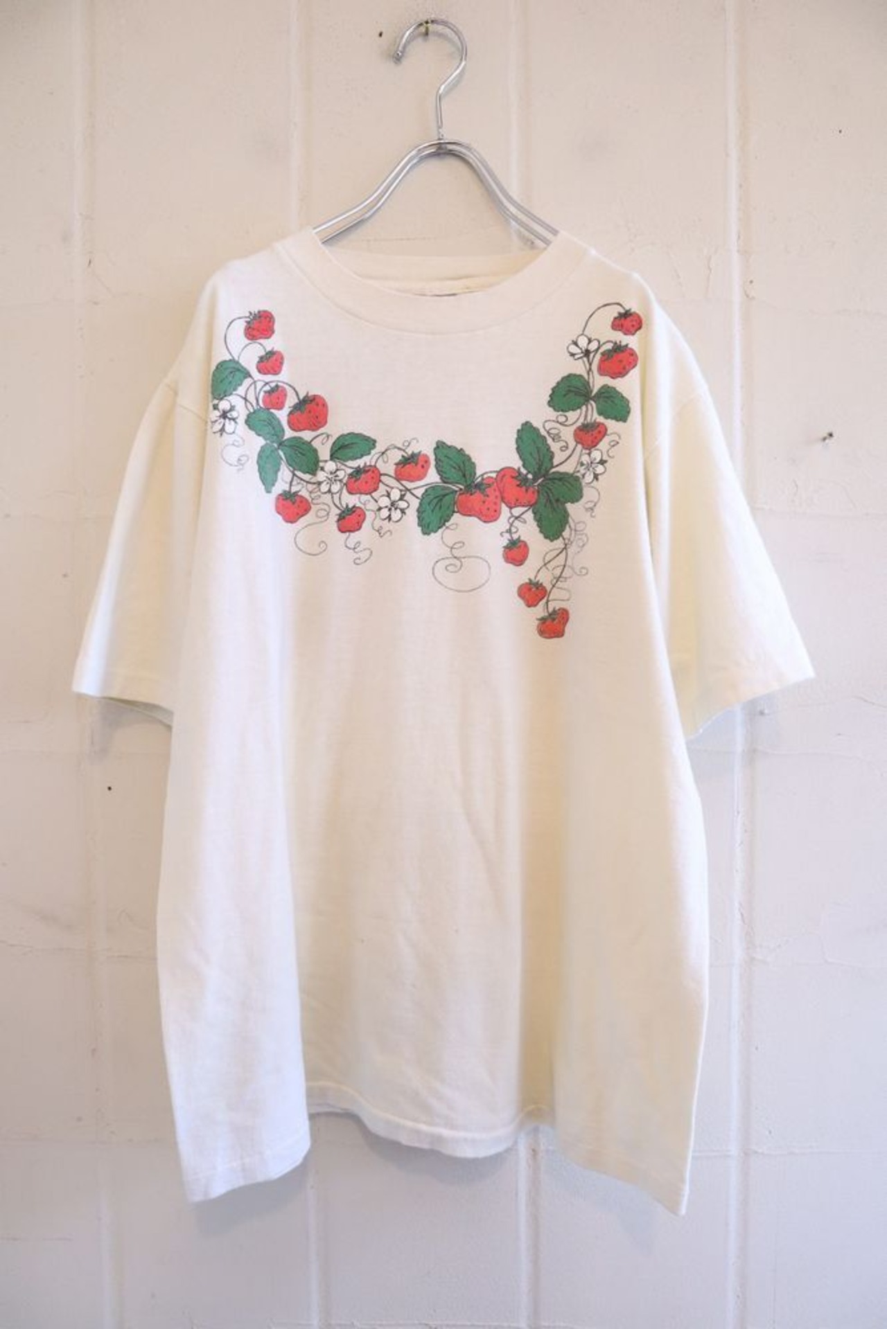 90s ivory×red×green strawberry print T-shirt [l-1151]