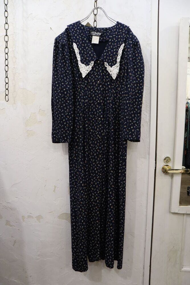 made in USA navy×white flower pattern long sleeve rayon dress [l-1183]