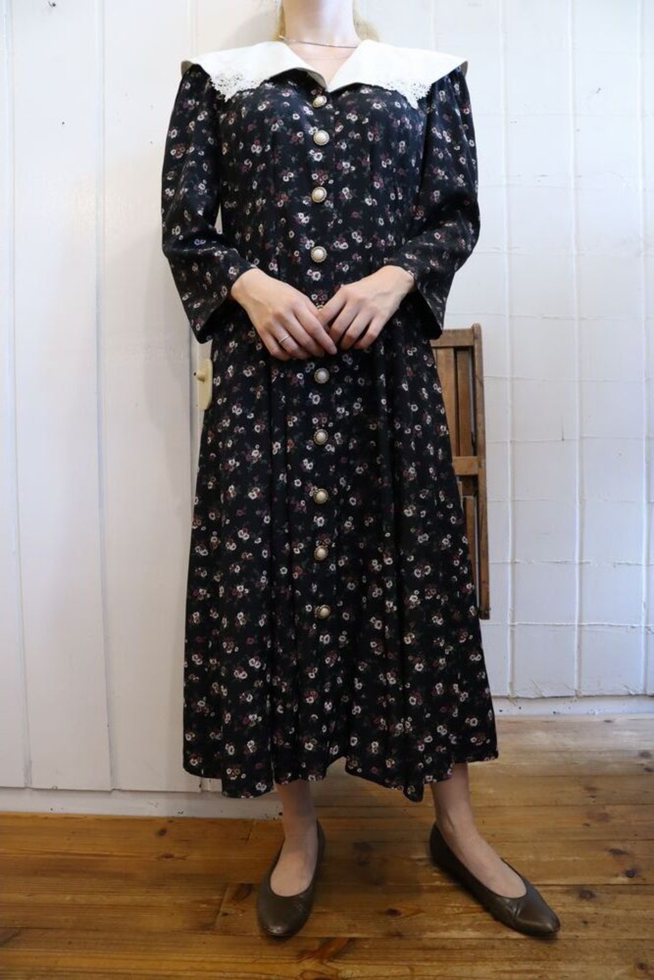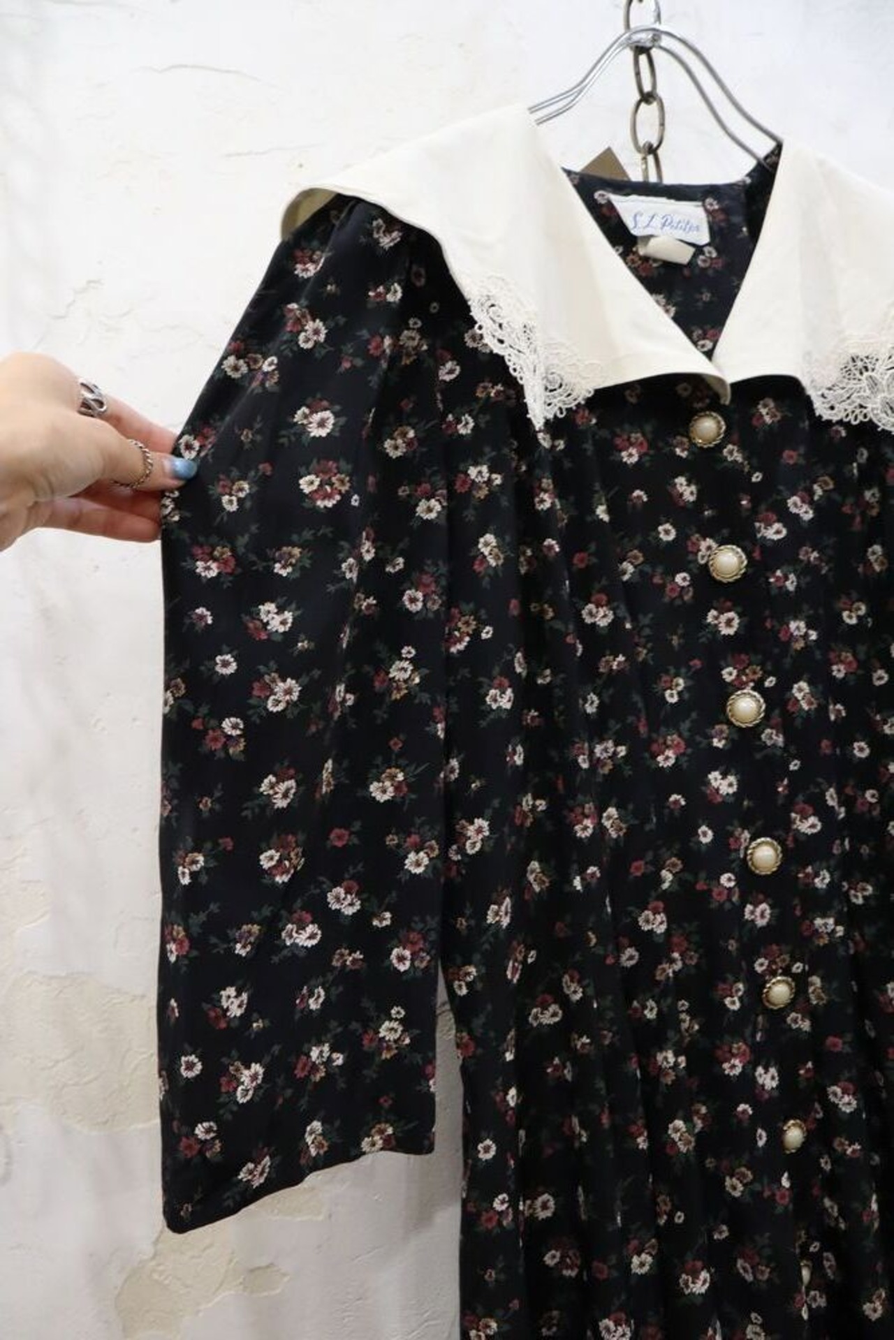 made in USA black×white flower pattern sailorcollar long sleeve dress [l-1185]