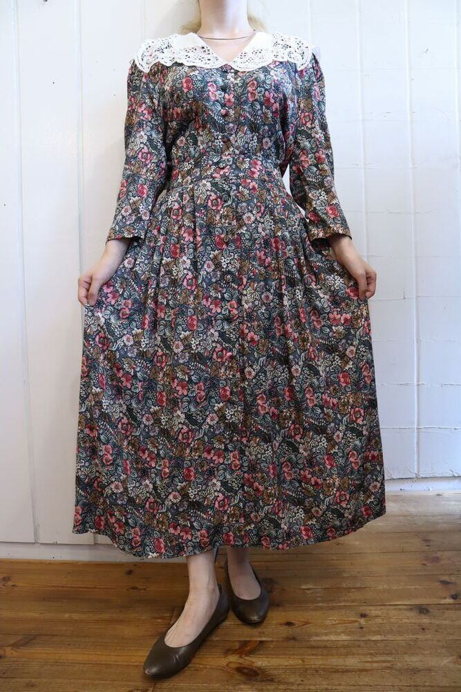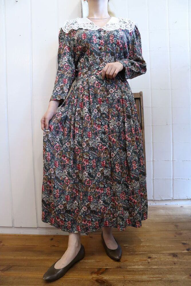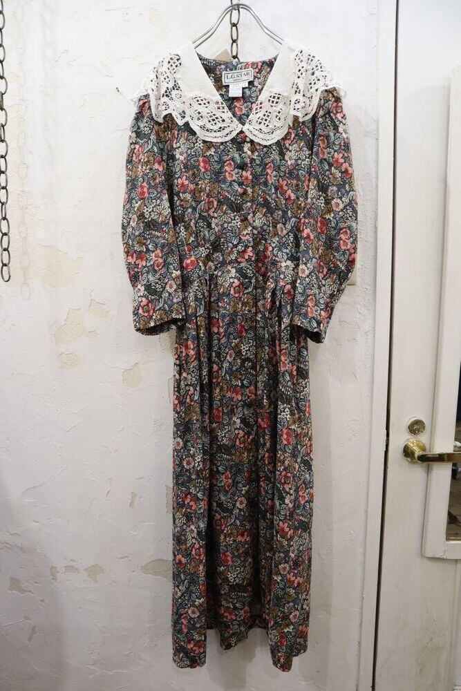 green×pink×white flower pattern lace long sleeve rayon dress [l-1186]