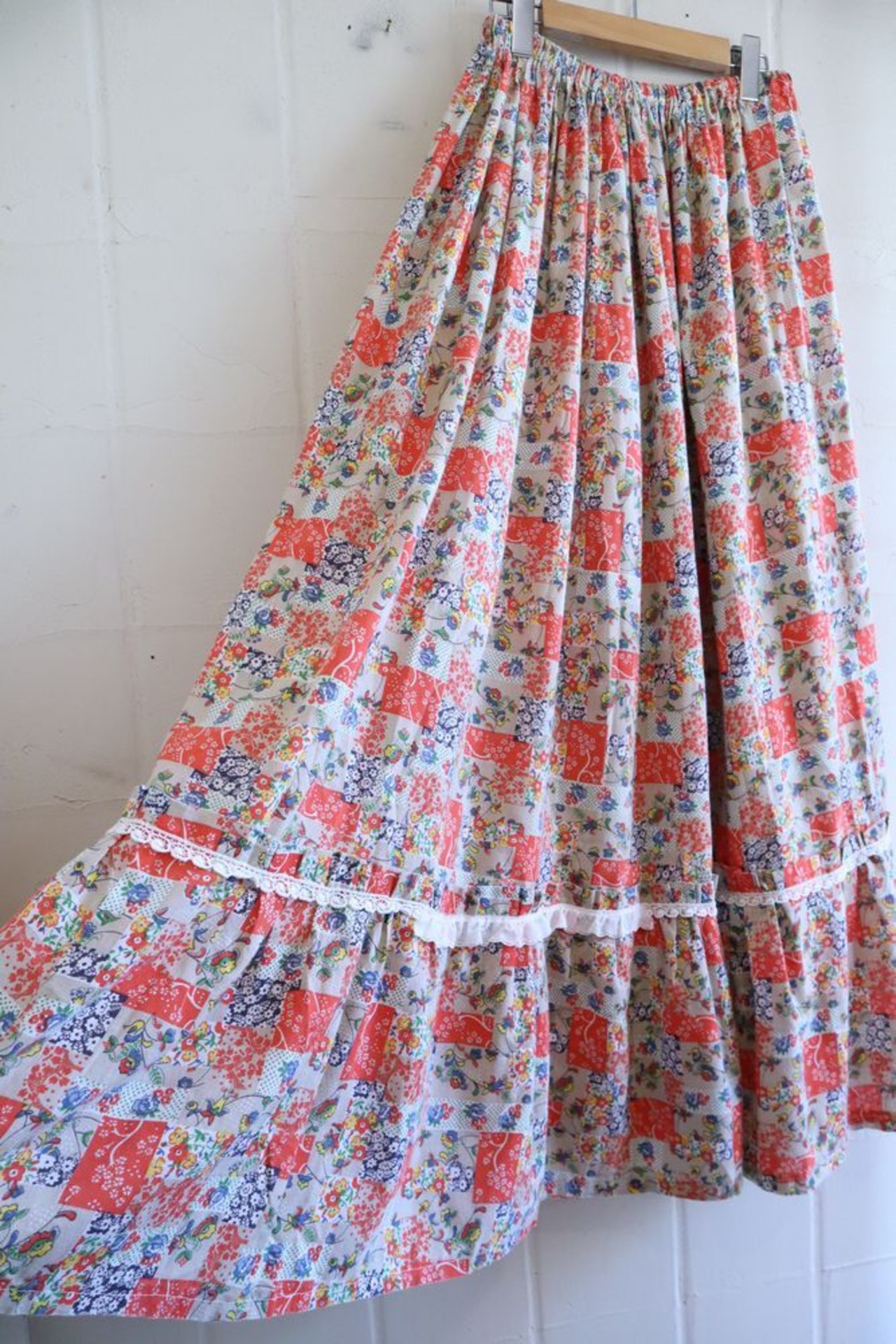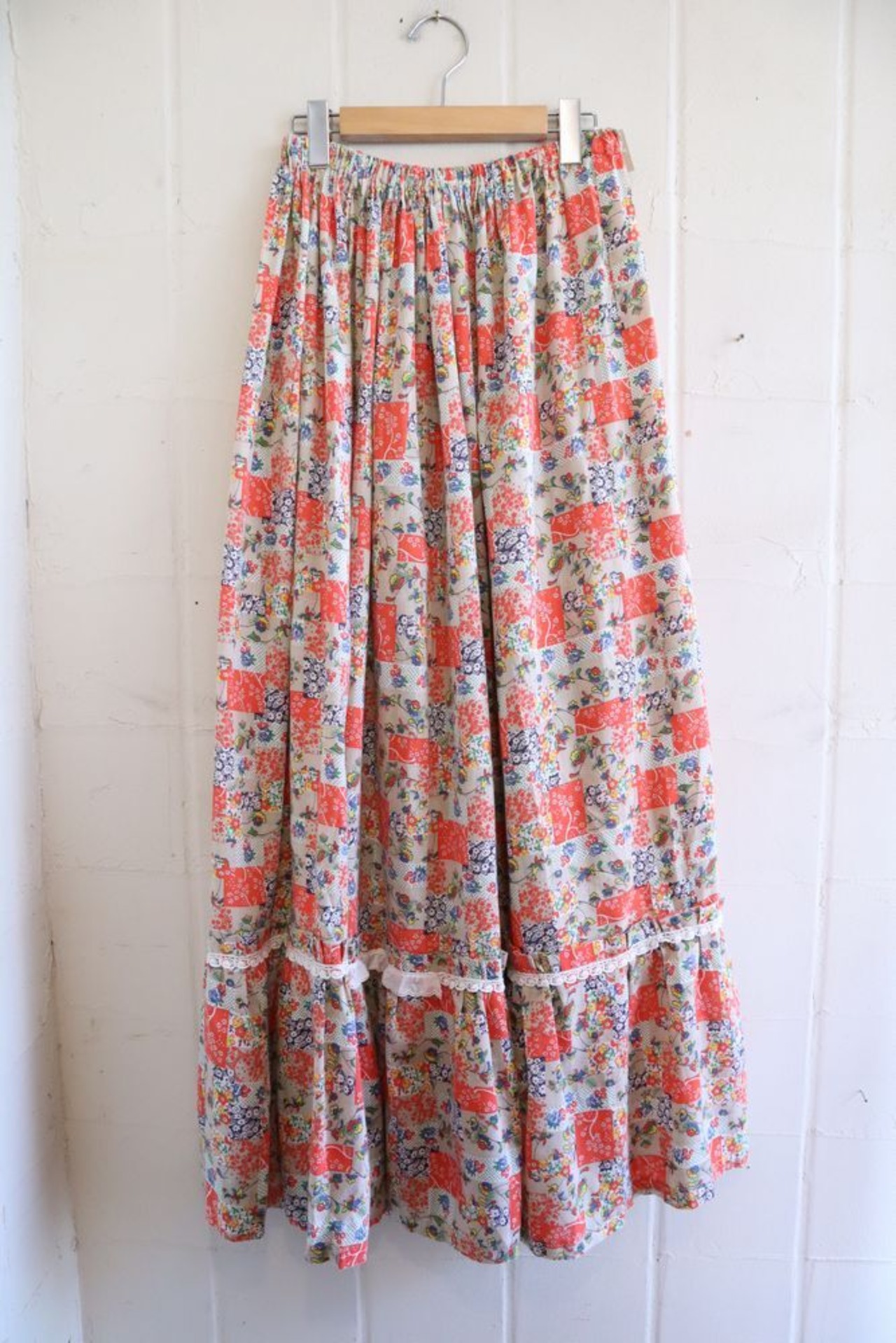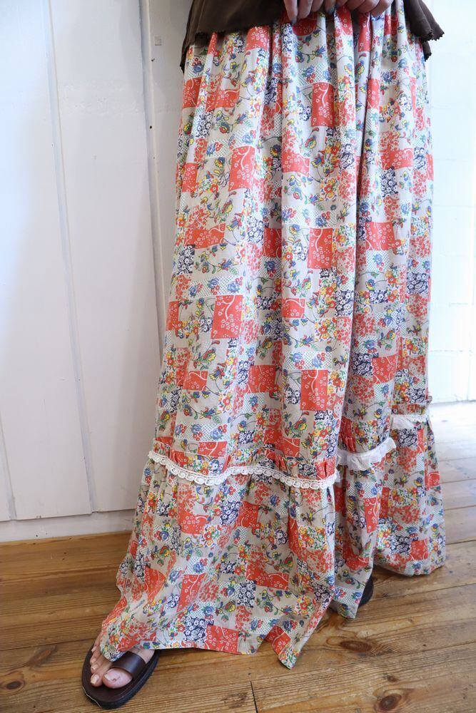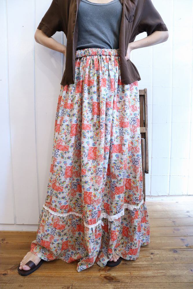 70s beige × pink red flower patchwork print long skirt [l-1188]