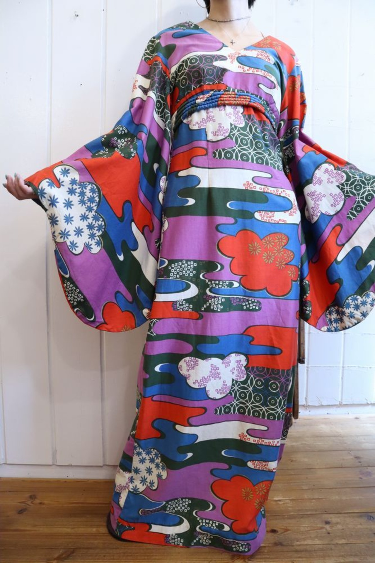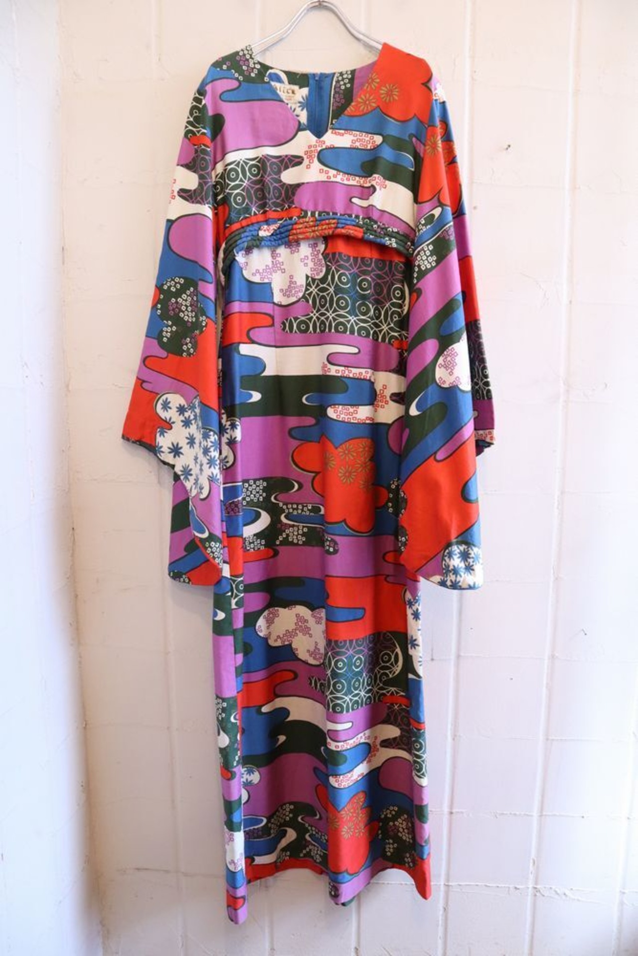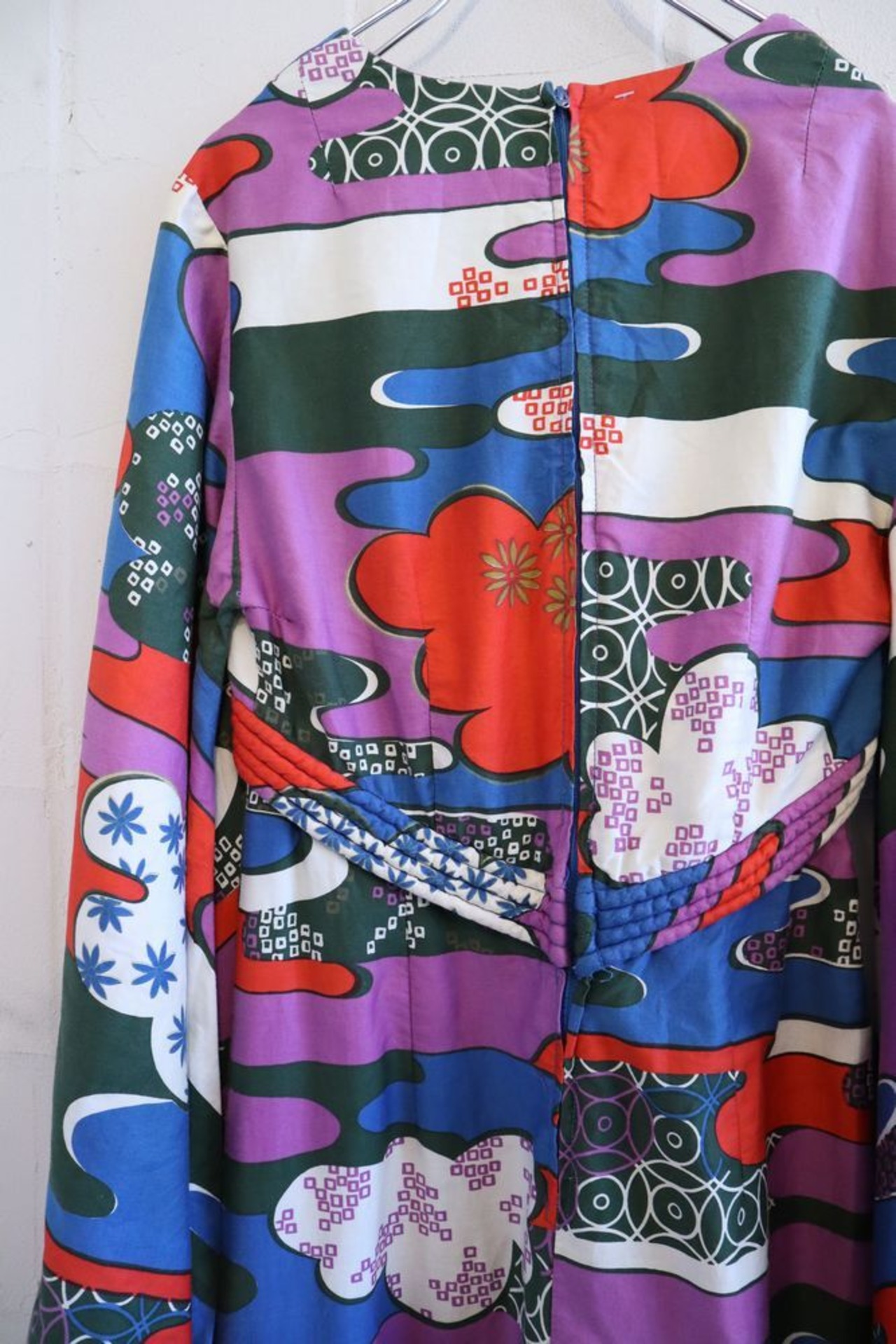 和柄のような珍しいテキスタイルが素敵な70sドレス。