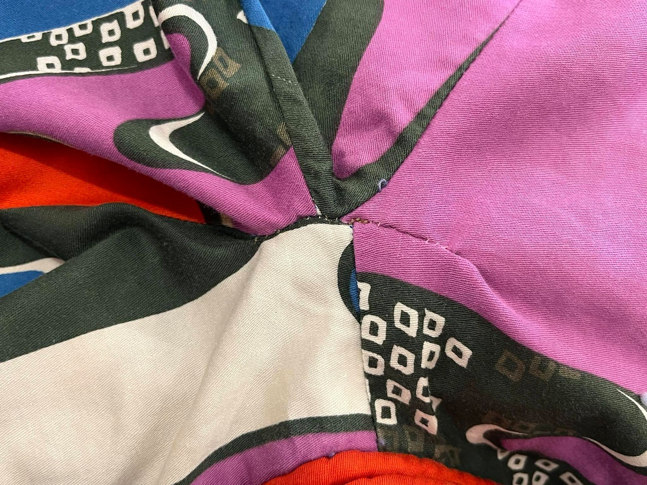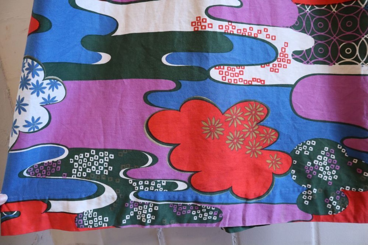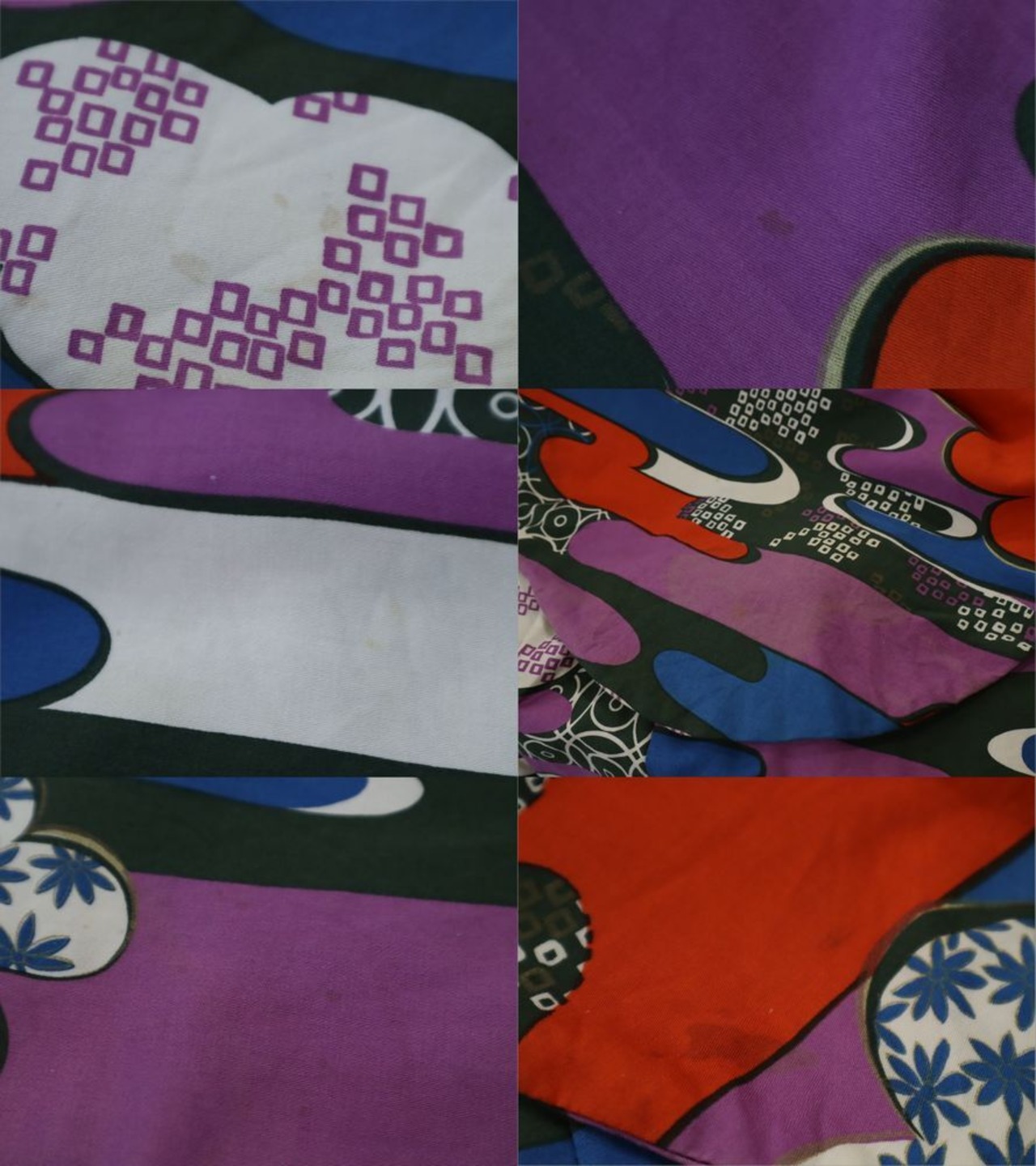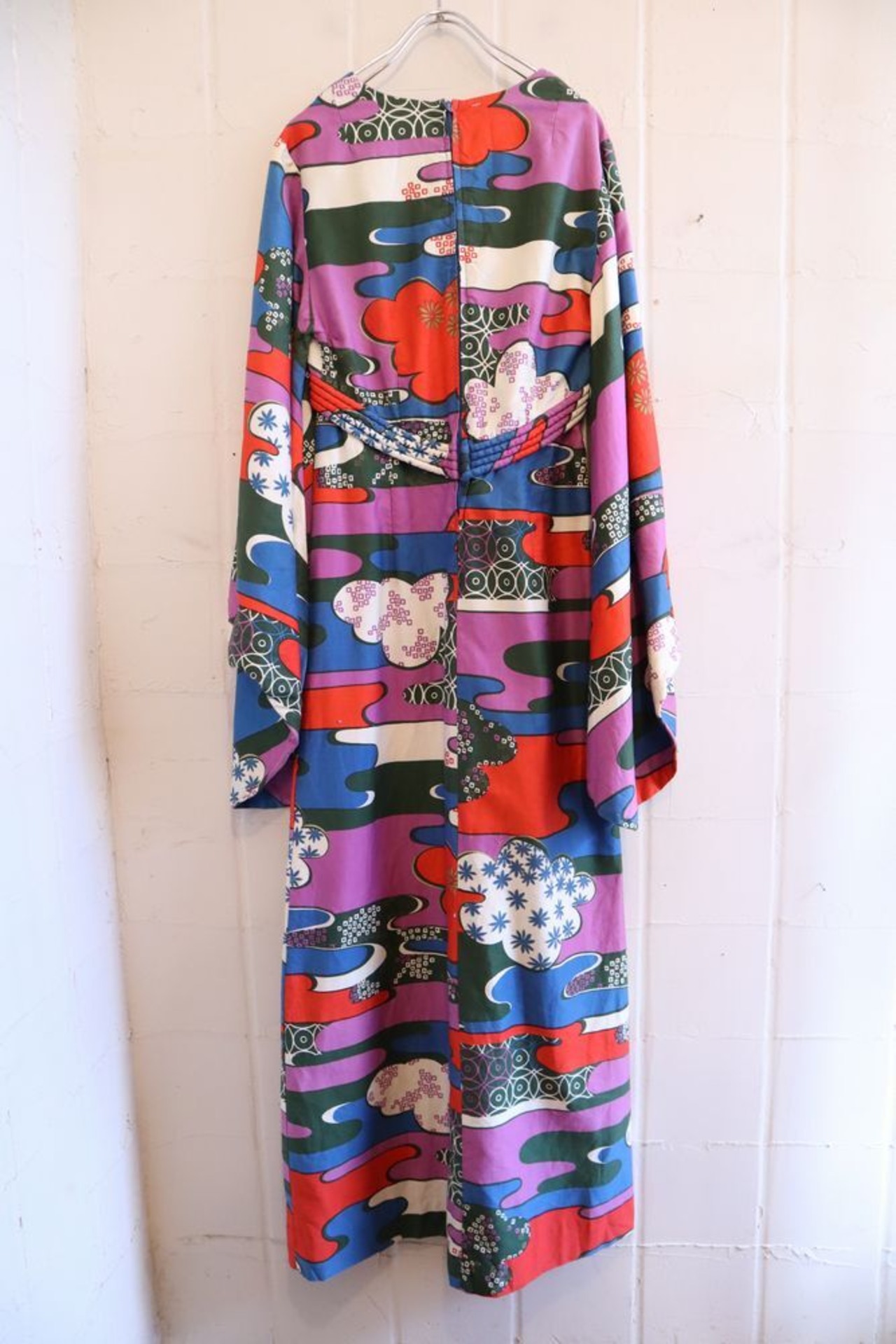 和柄のような珍しいテキスタイルが素敵な70sドレス。