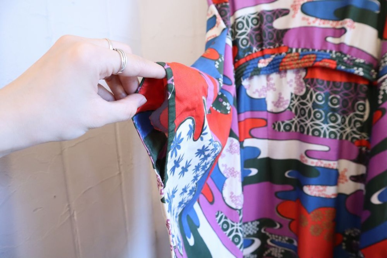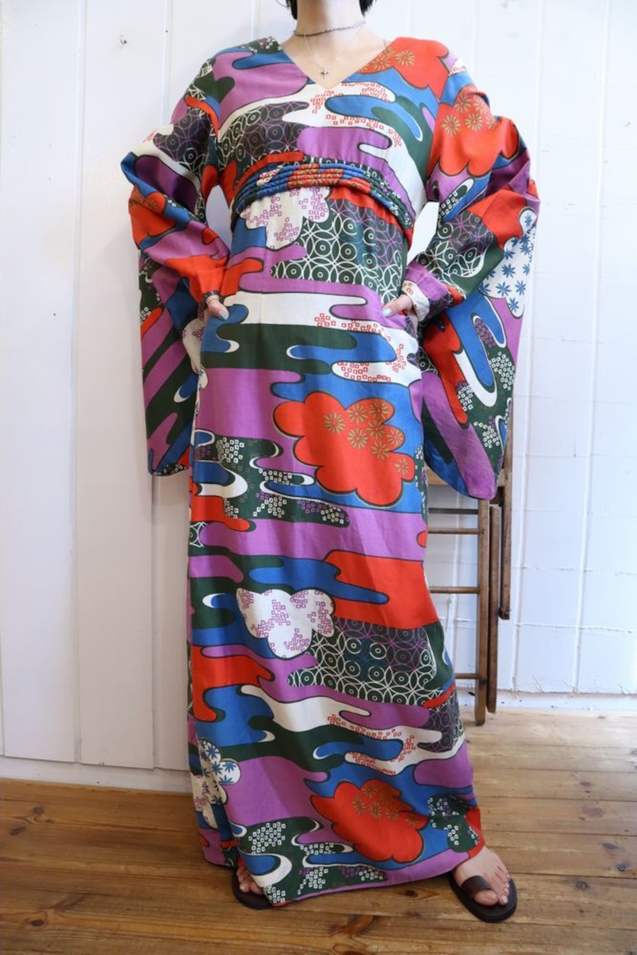 70s red×purple×colorful volume sleeve dress [l-1203]