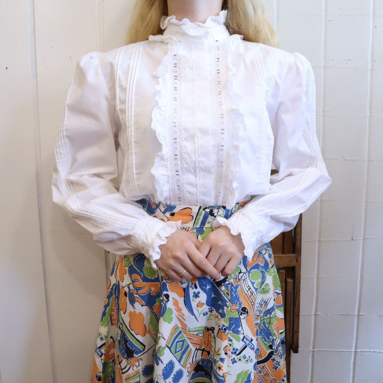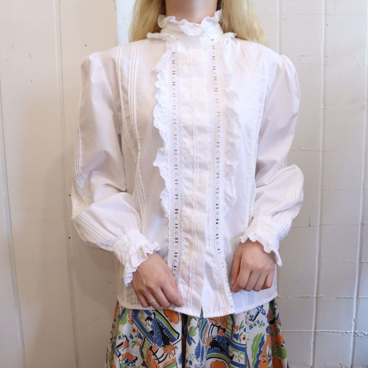 レースのフリルやスタンドカラー、パフスリーブ等の甘々なデザインが可愛いブラウス。
