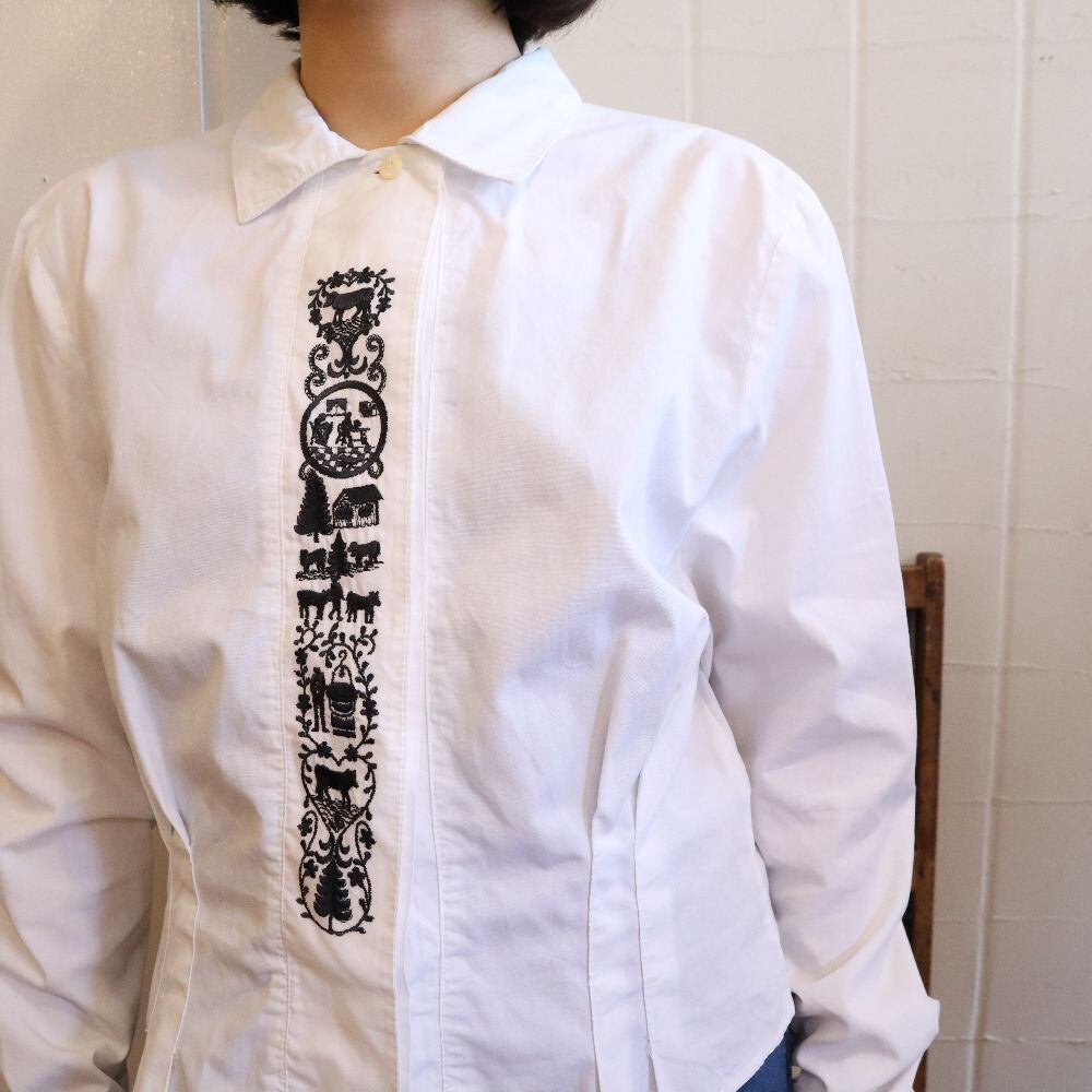 前立て部分の人や動物、家等の刺繍が可愛いブラウス。