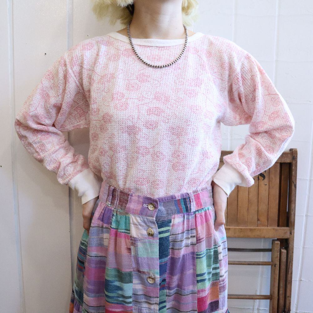 淡いピンクカラーに手描きタッチの花柄が可愛いサーマルトップス。