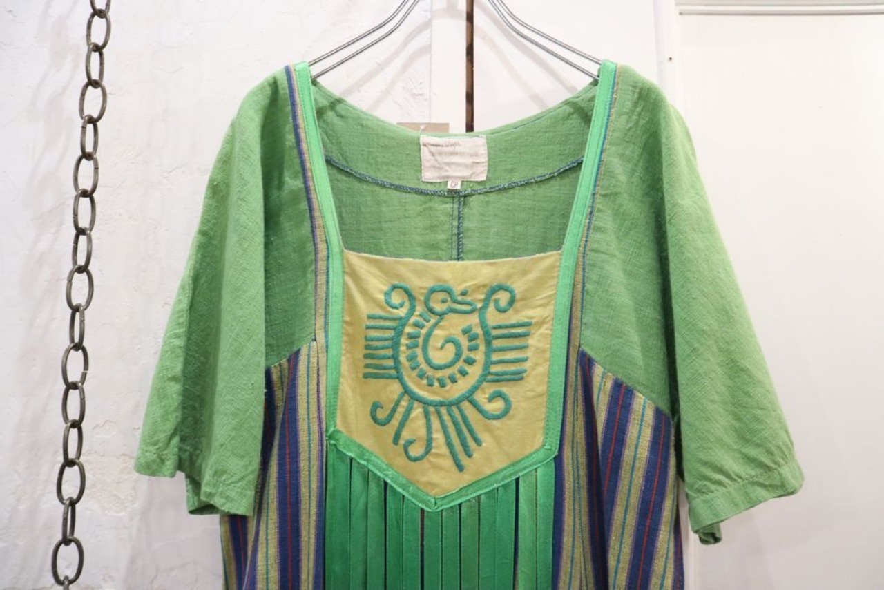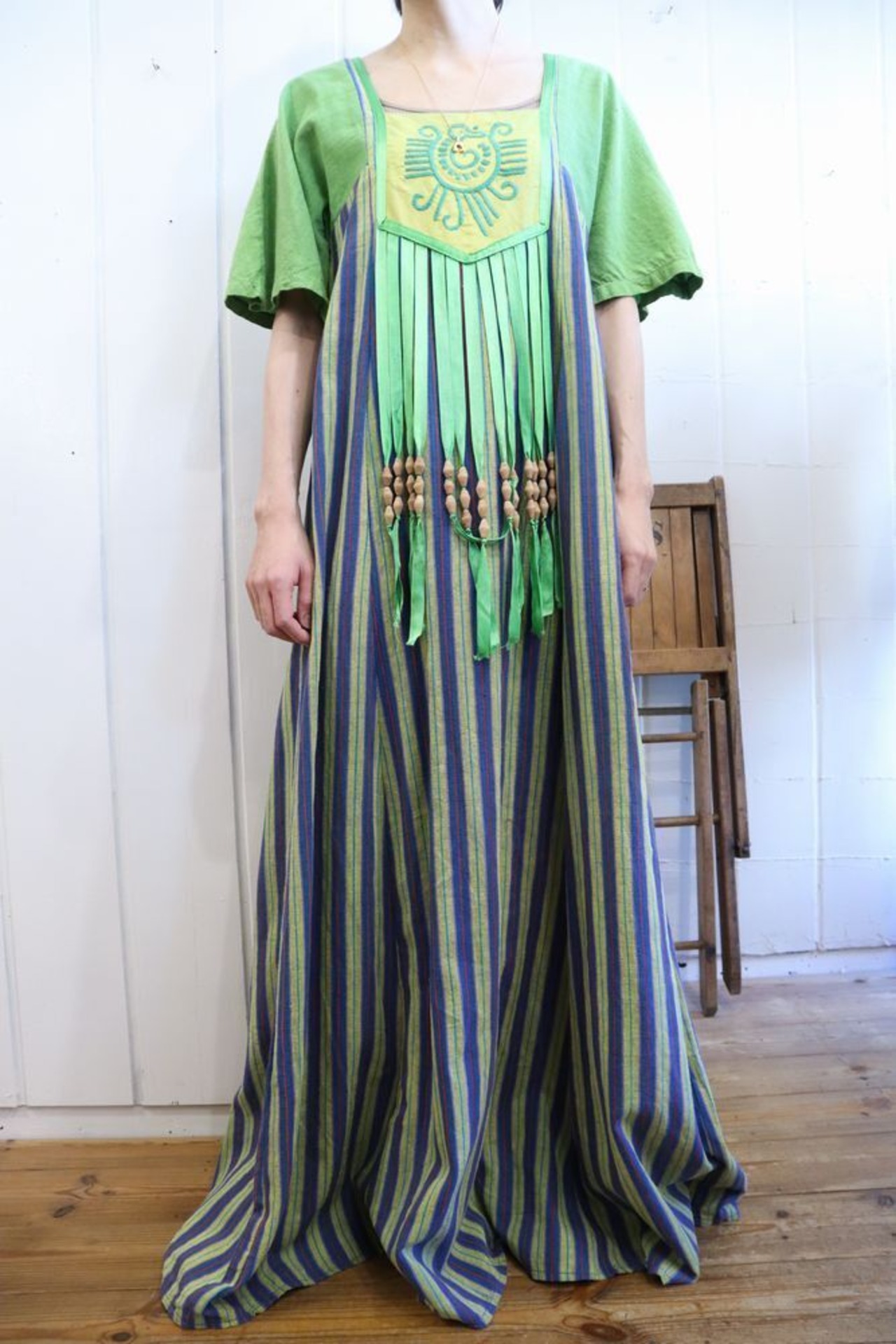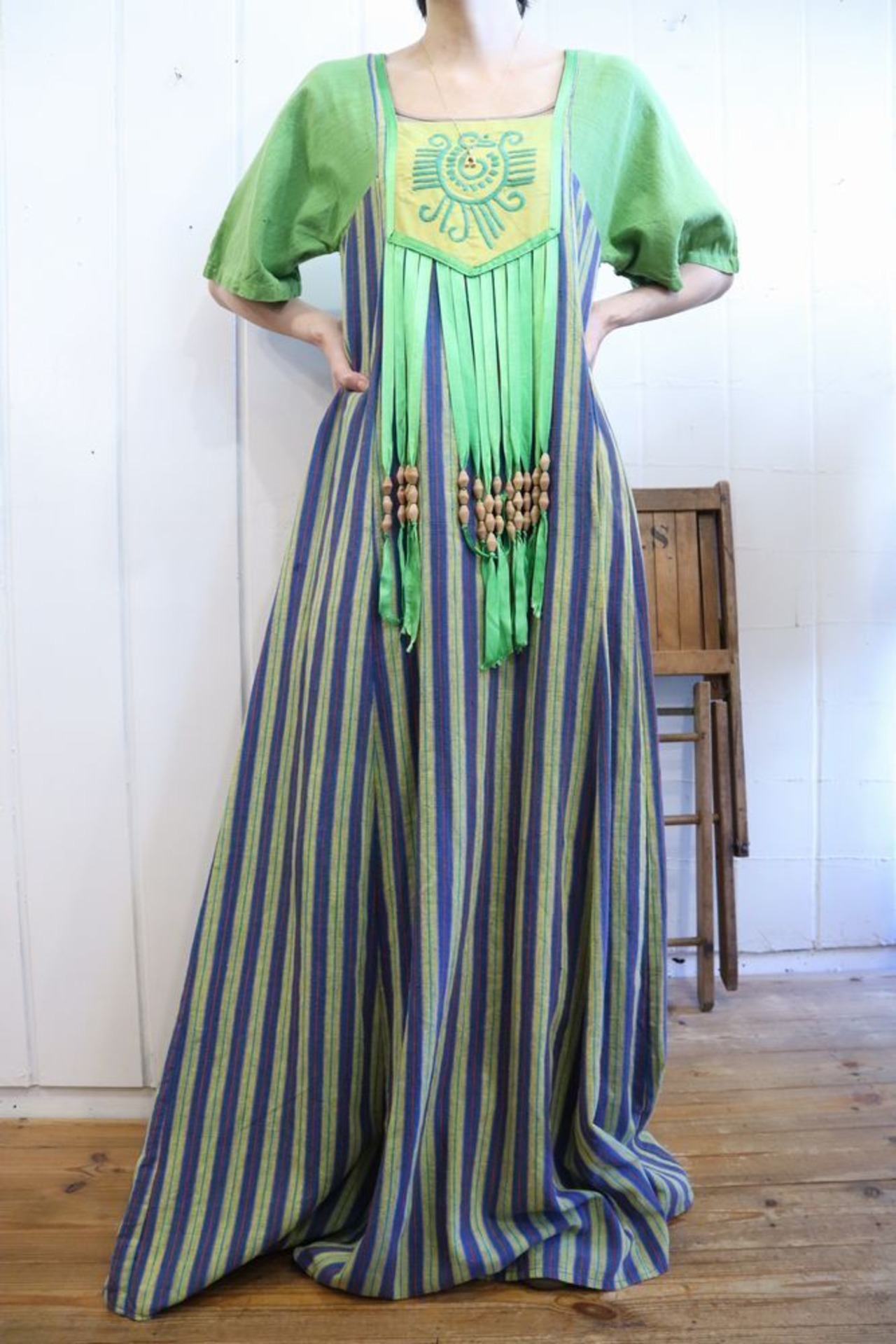70s green × blue stripe ribbon fringe long dress [l-41906]