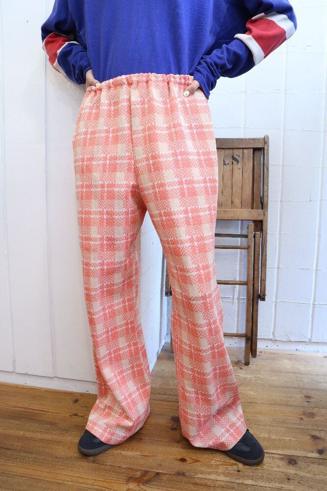 70s pink orange × beige plaid polyester easy pants [l-1271]