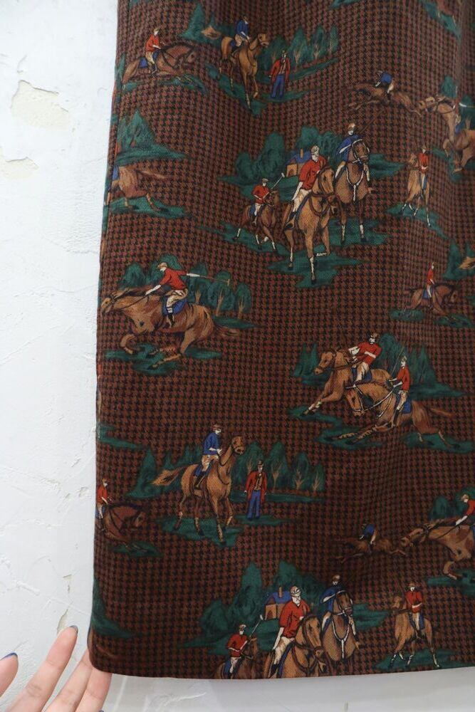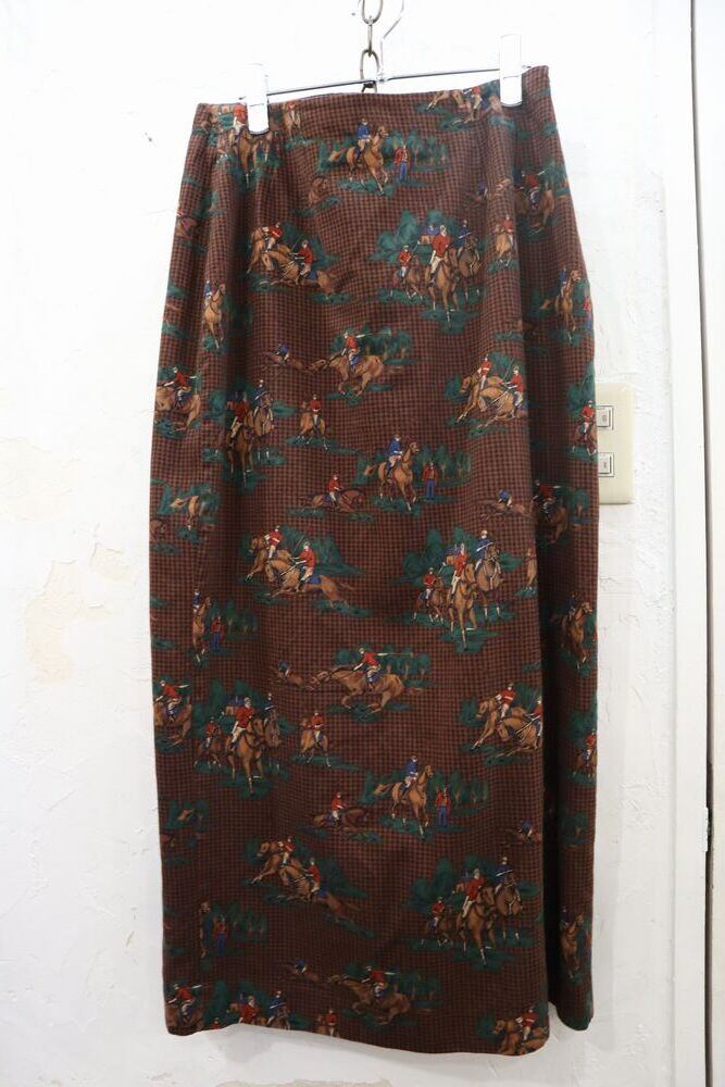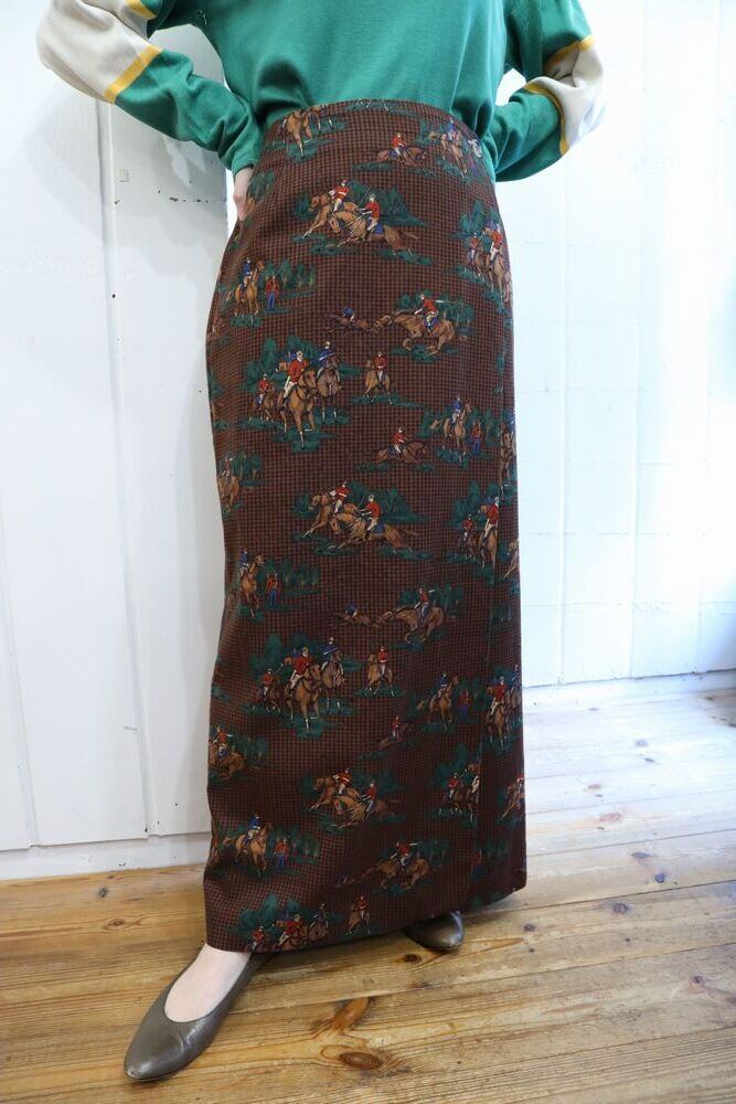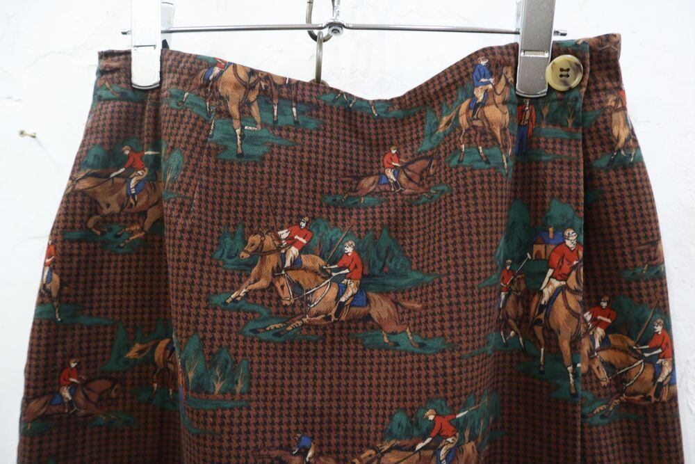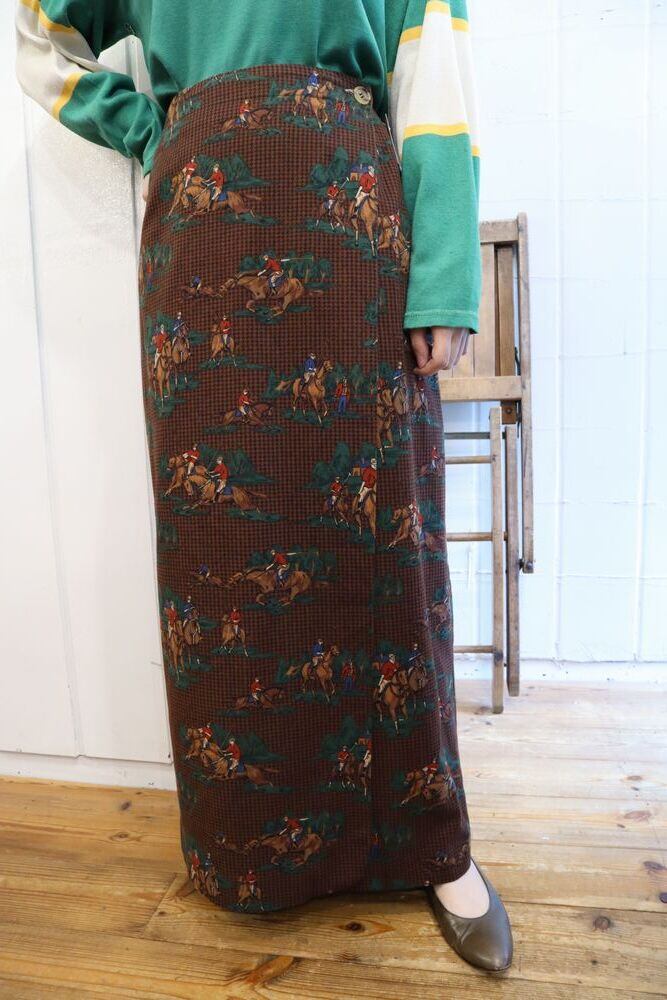 made in USA brown×green×red horse pattern wrap cotton skirt [l-1296]