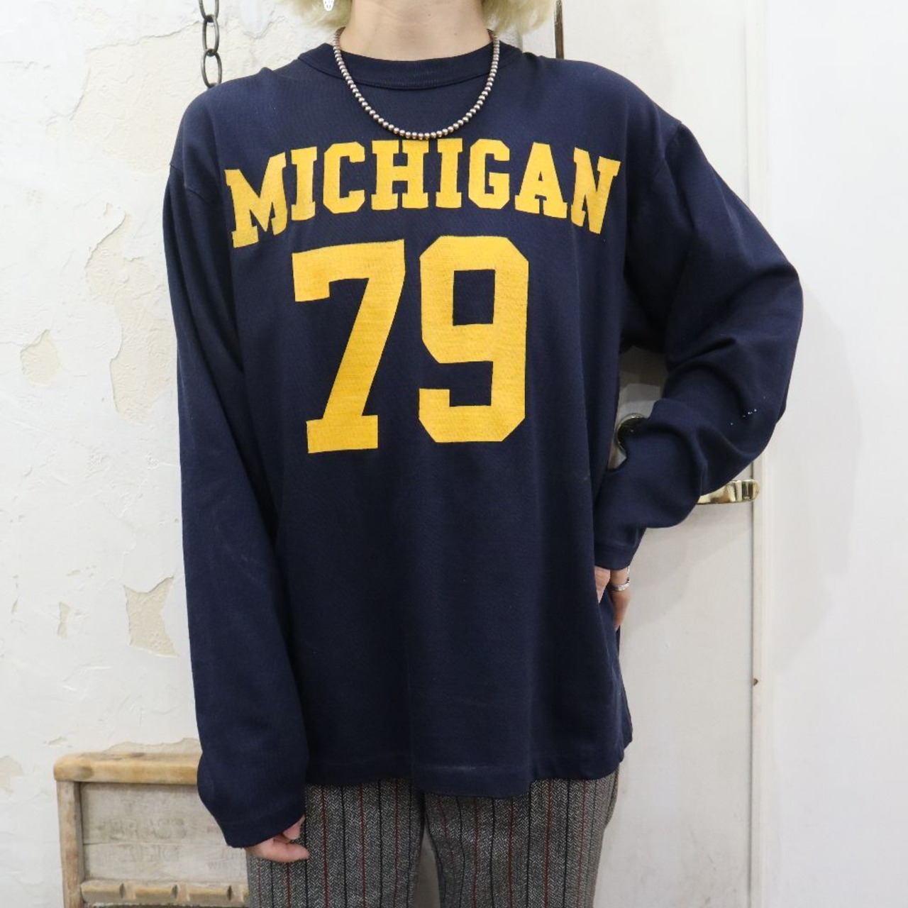 いくつか白っぽい汚れ、全体的に毛羽立ち、一部インクの様な汚れがございますが、古着の味として着て頂けるかと思われます。