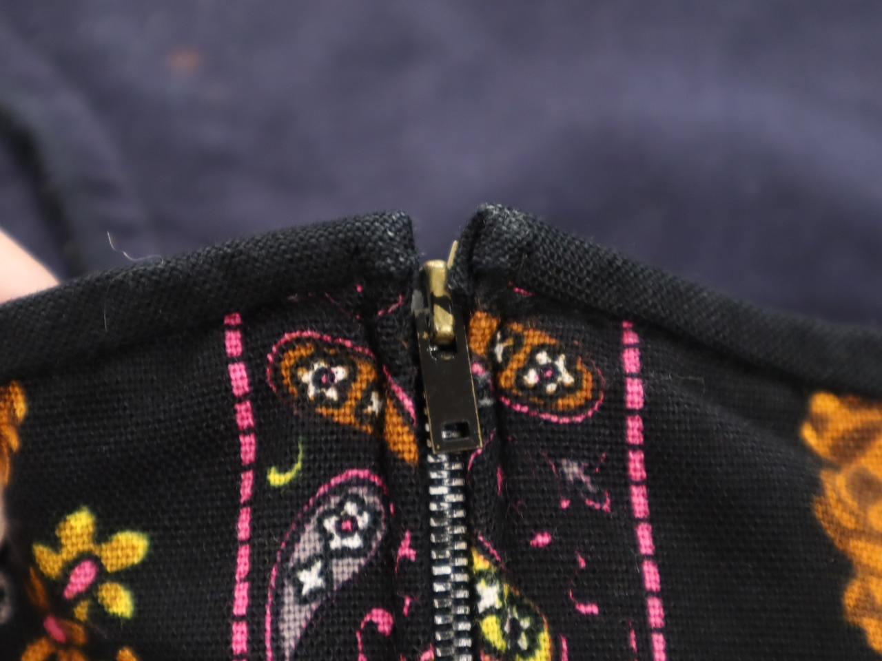 ウエスト切替部分に生地が足されたようなリペアがあり、縫い目あたりに若干キズ・糸や布端の飛び出しがございます。
