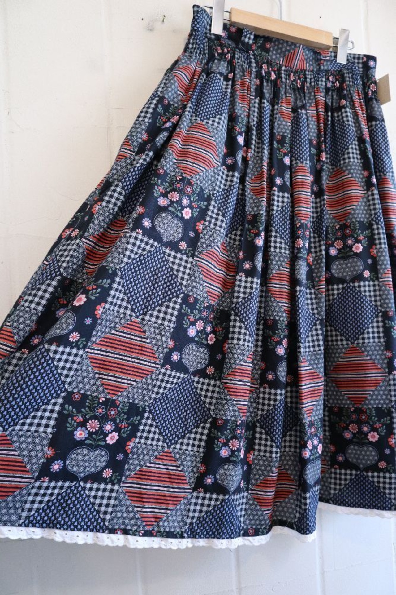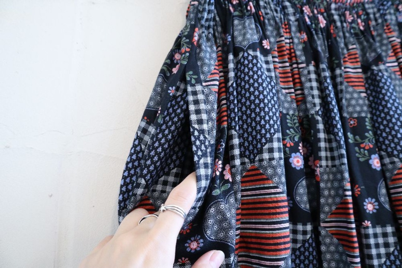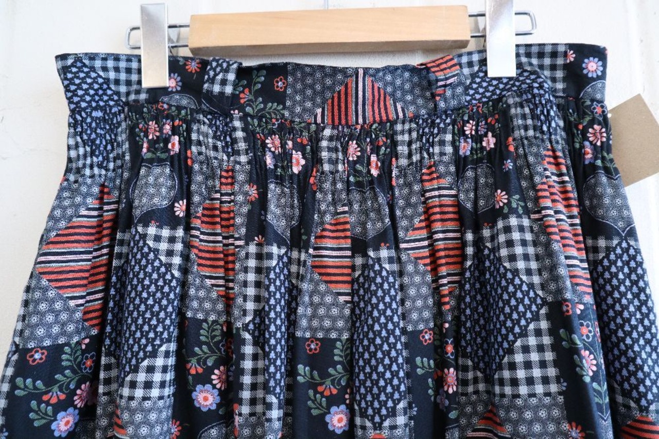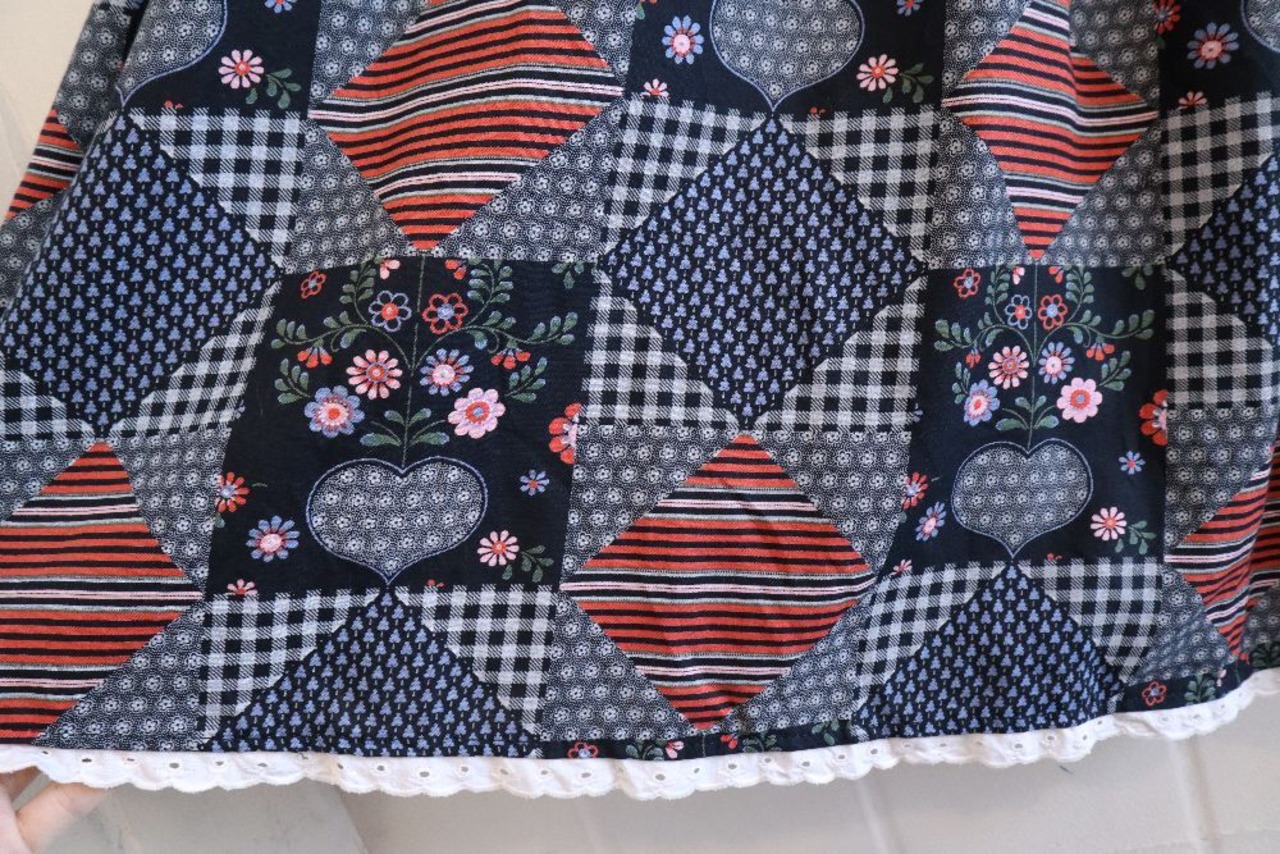 ダイヤやハート、チェック・お花などパッチワークのような柄がとても可愛いチロルスカートです。