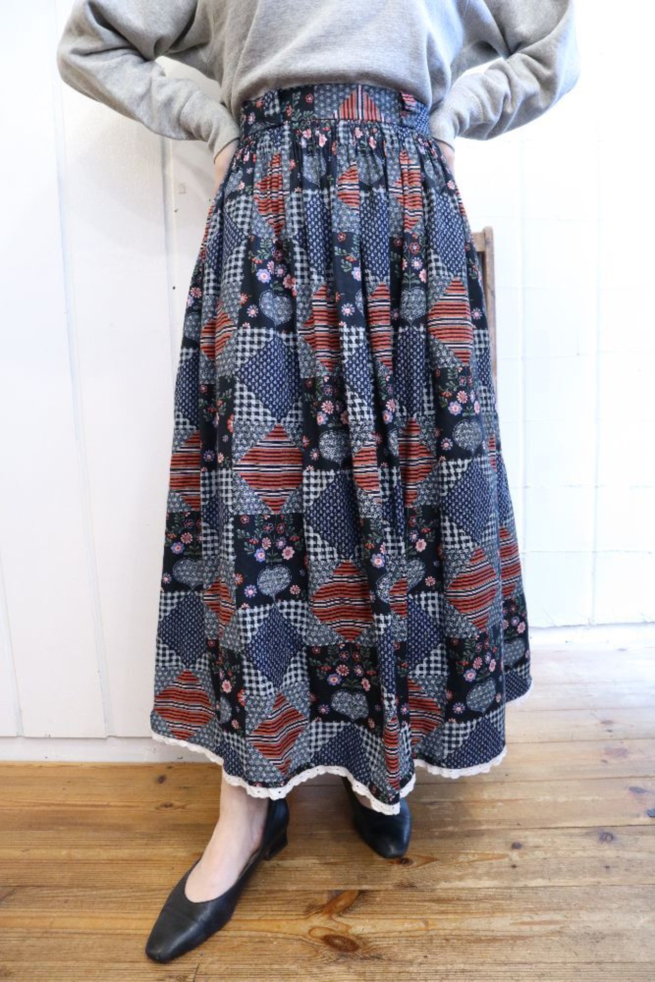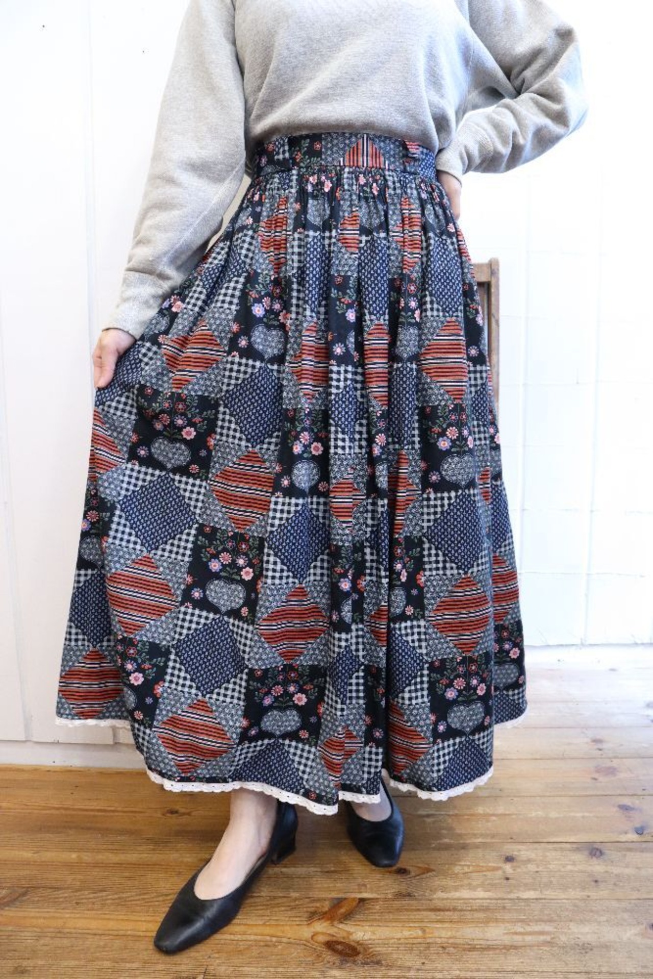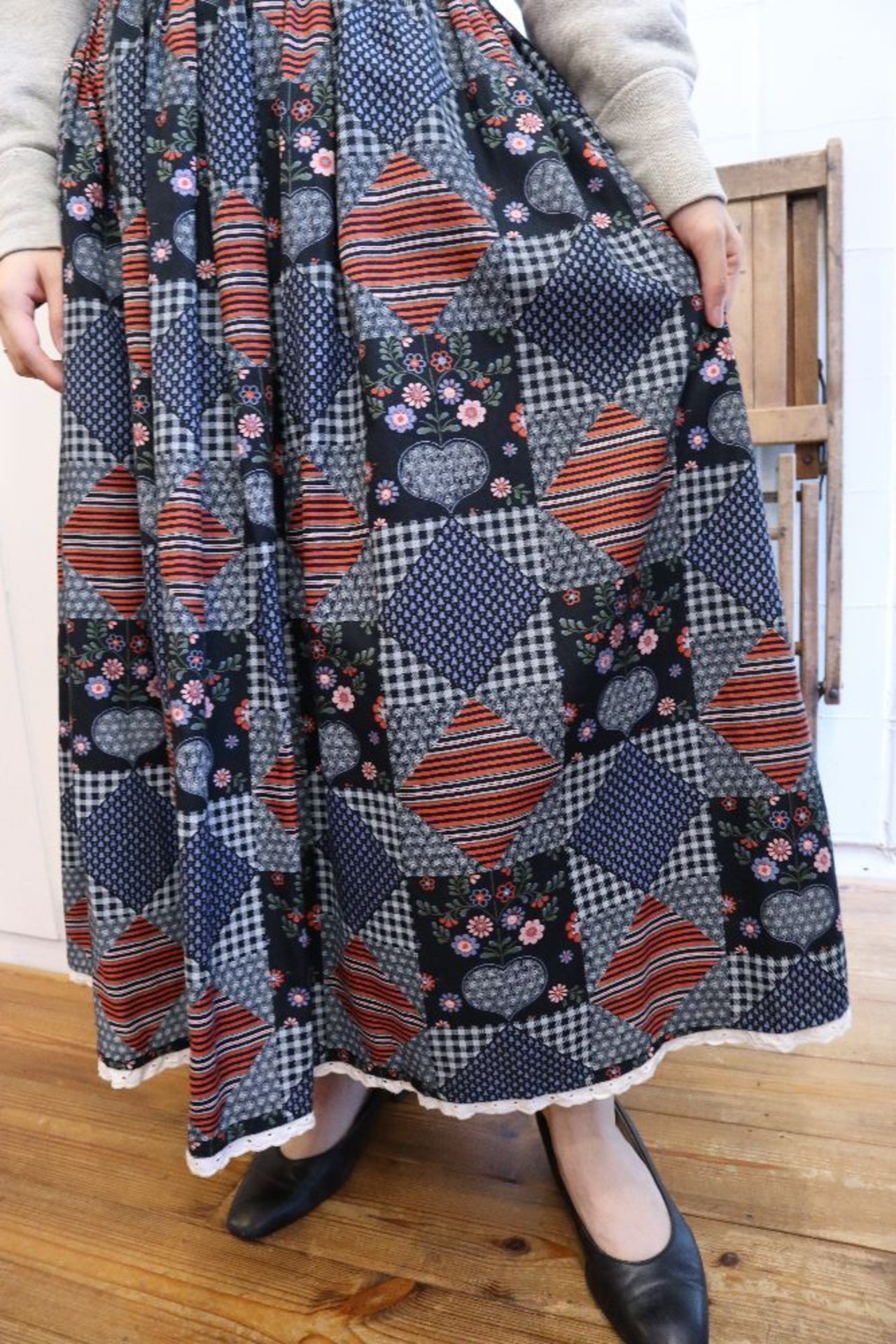 ダイヤやハート、チェック・お花などパッチワークのような柄がとても可愛いチロルスカートです。