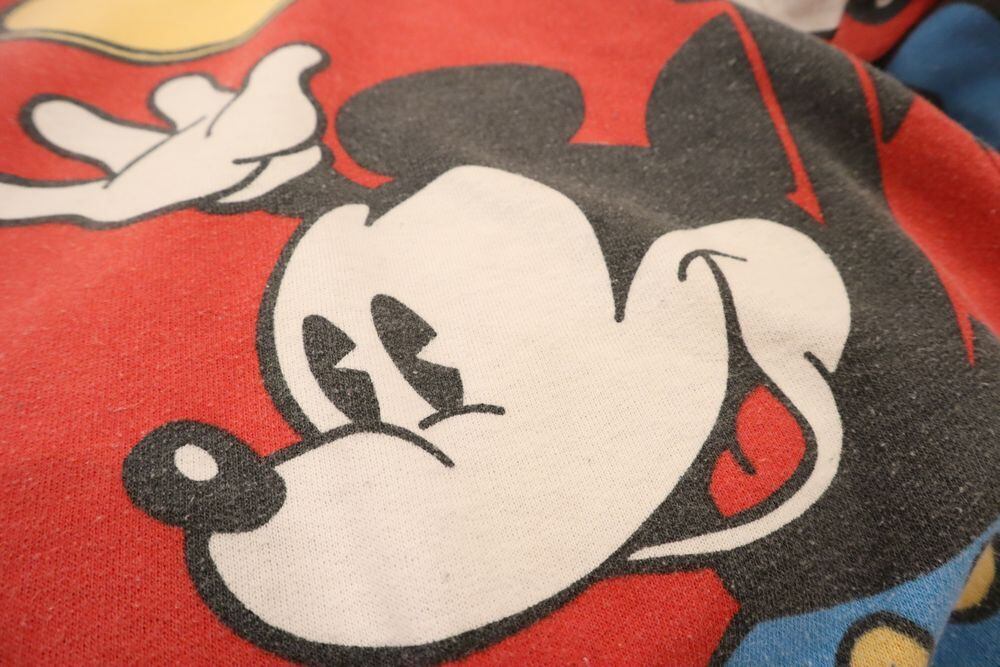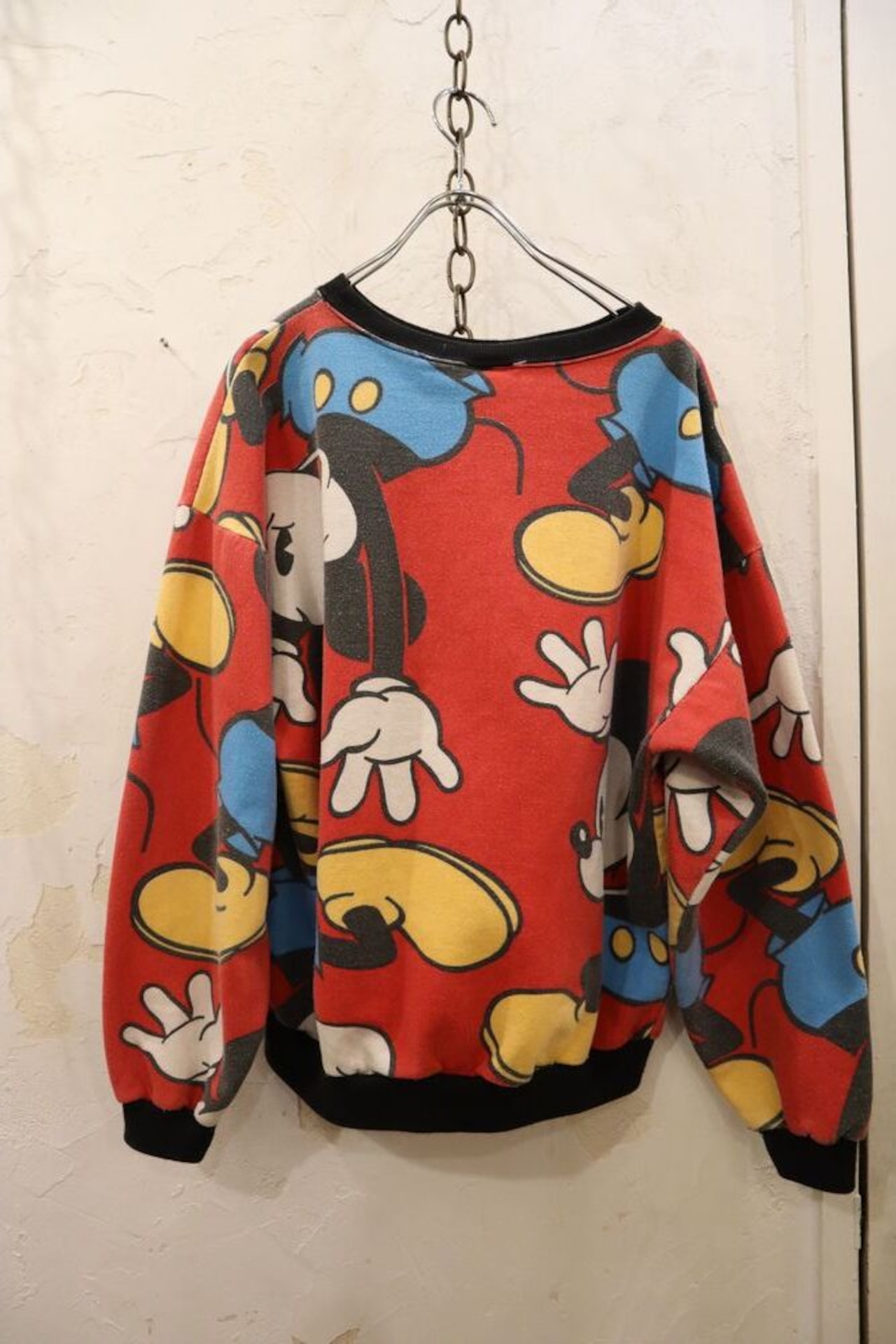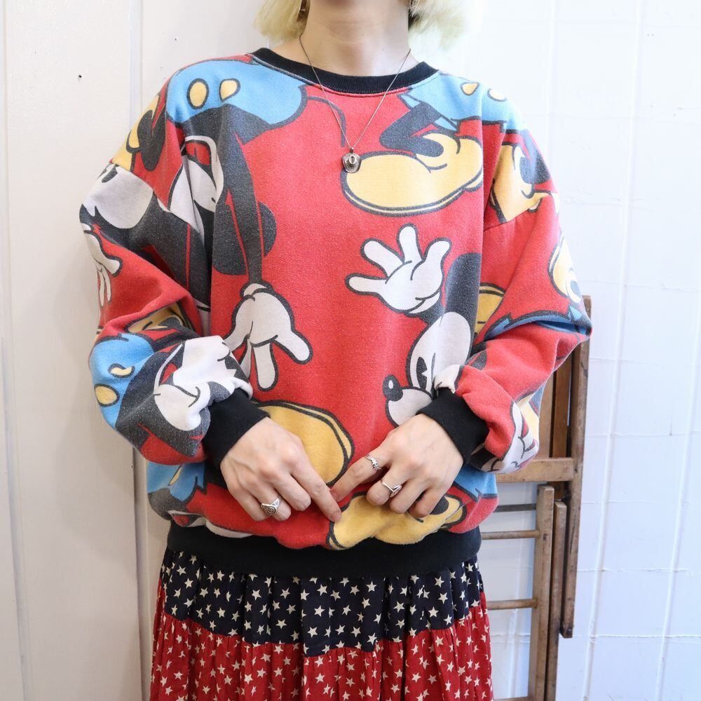 目を惹くレッドカラーと様々な向きでデザインされたミッキー柄が可愛いスウェットです。