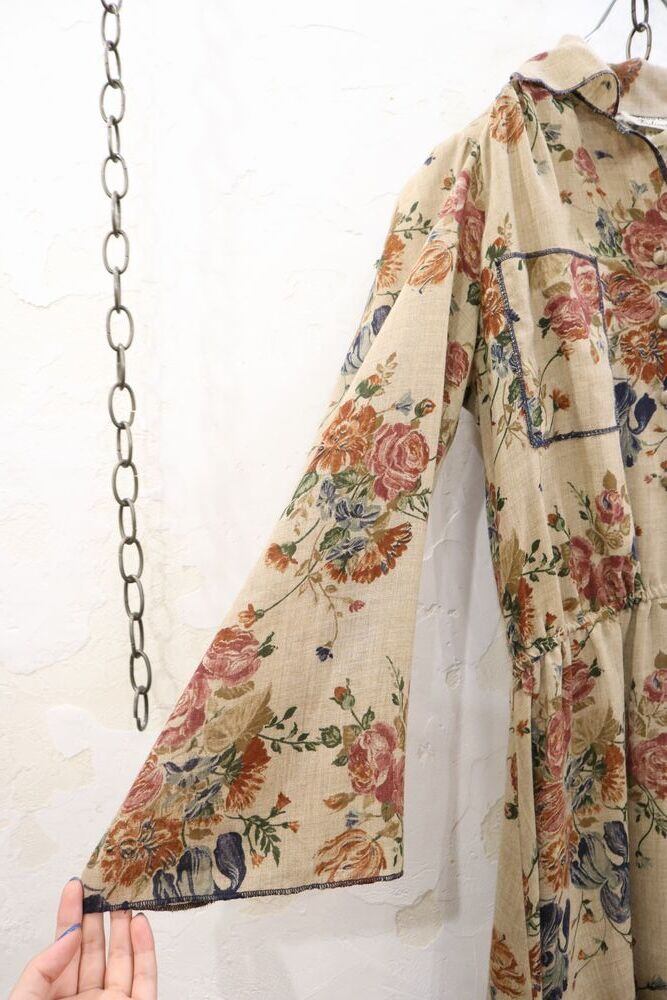 70s beige×red×green flower pattern flaresleeve dress [l-1359]