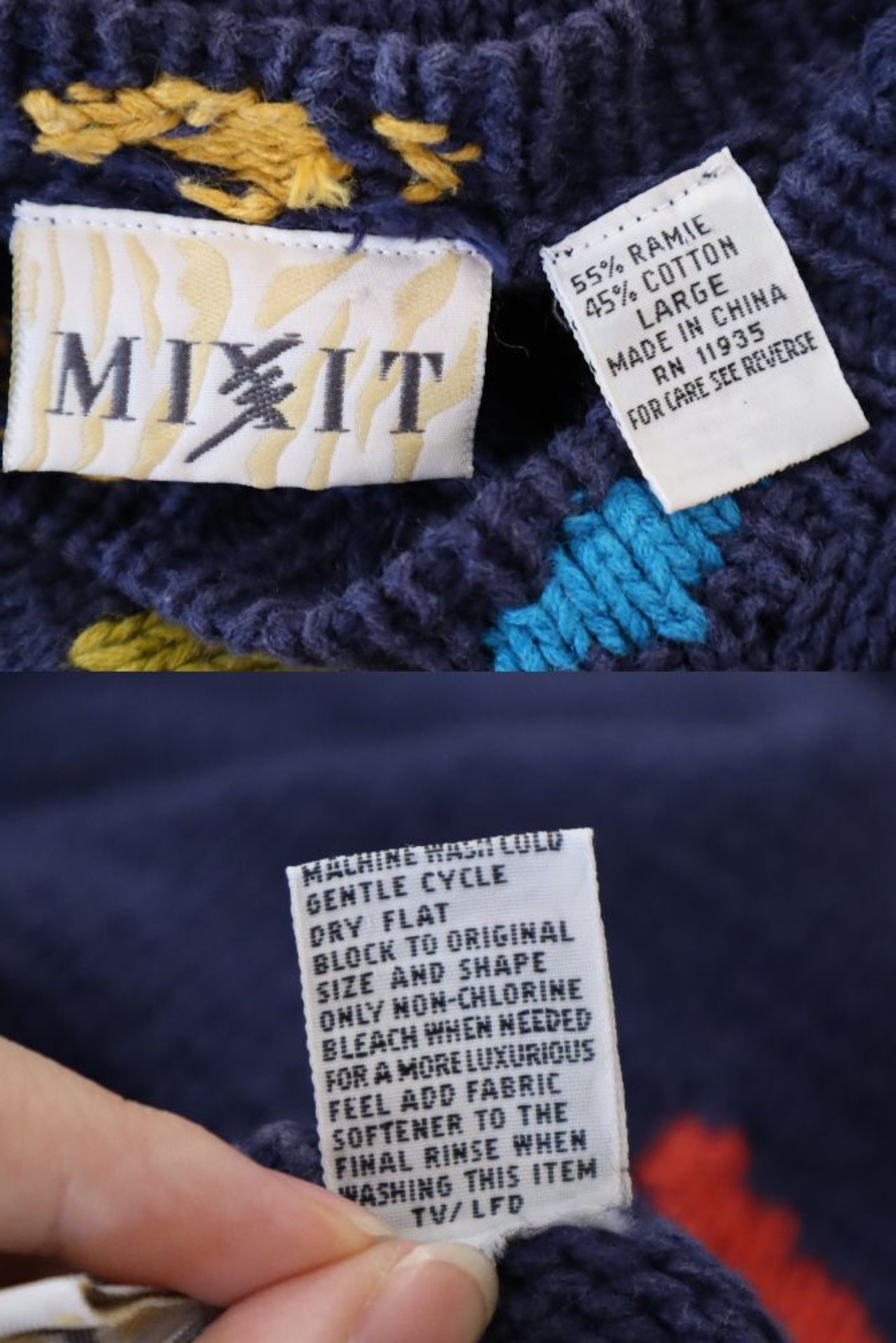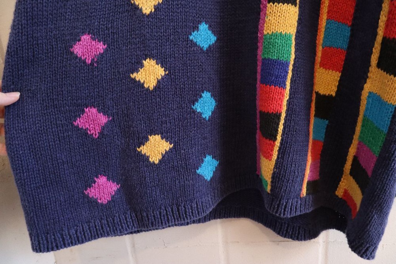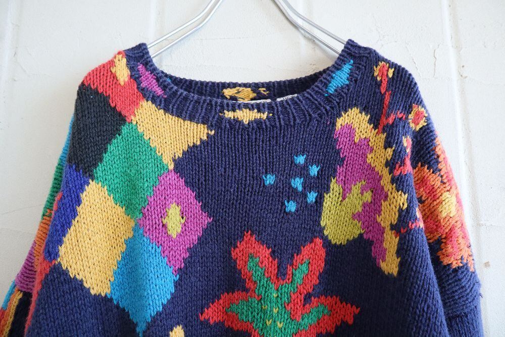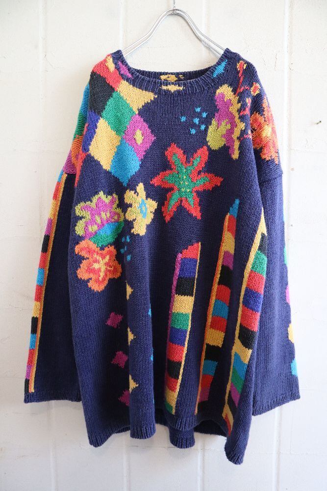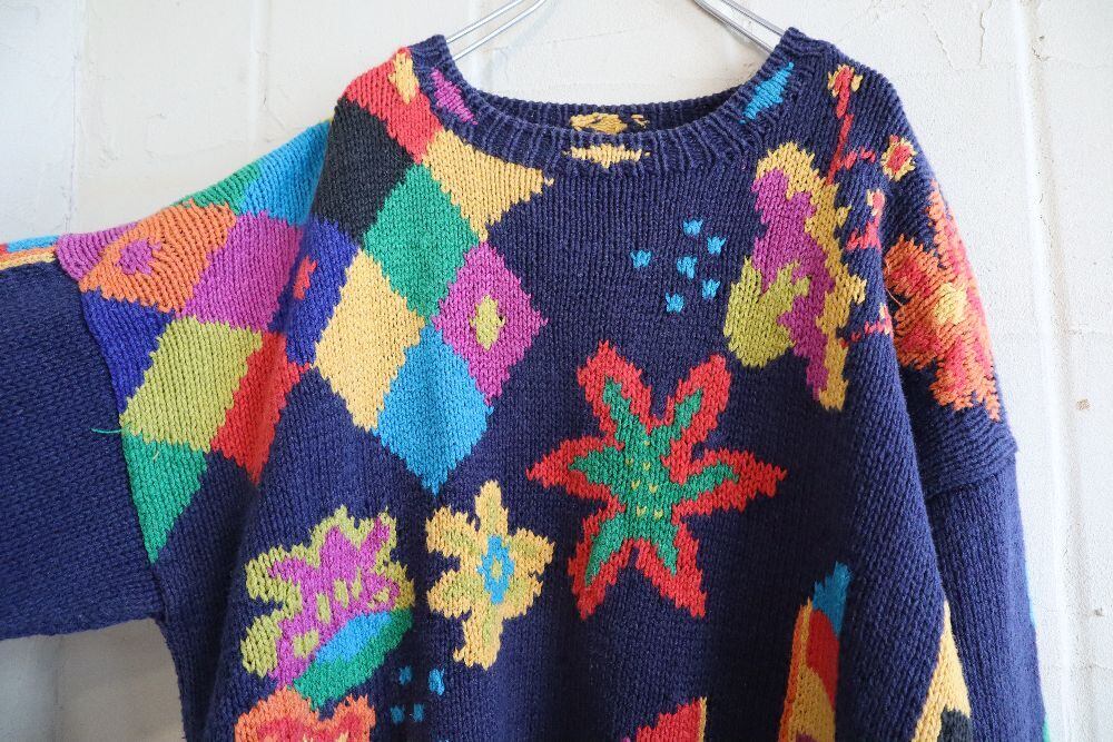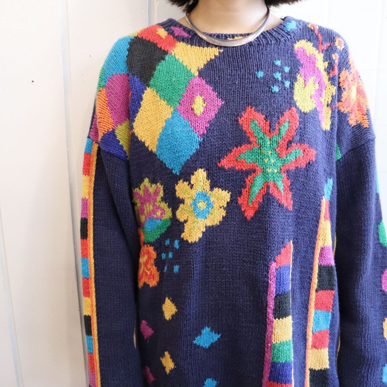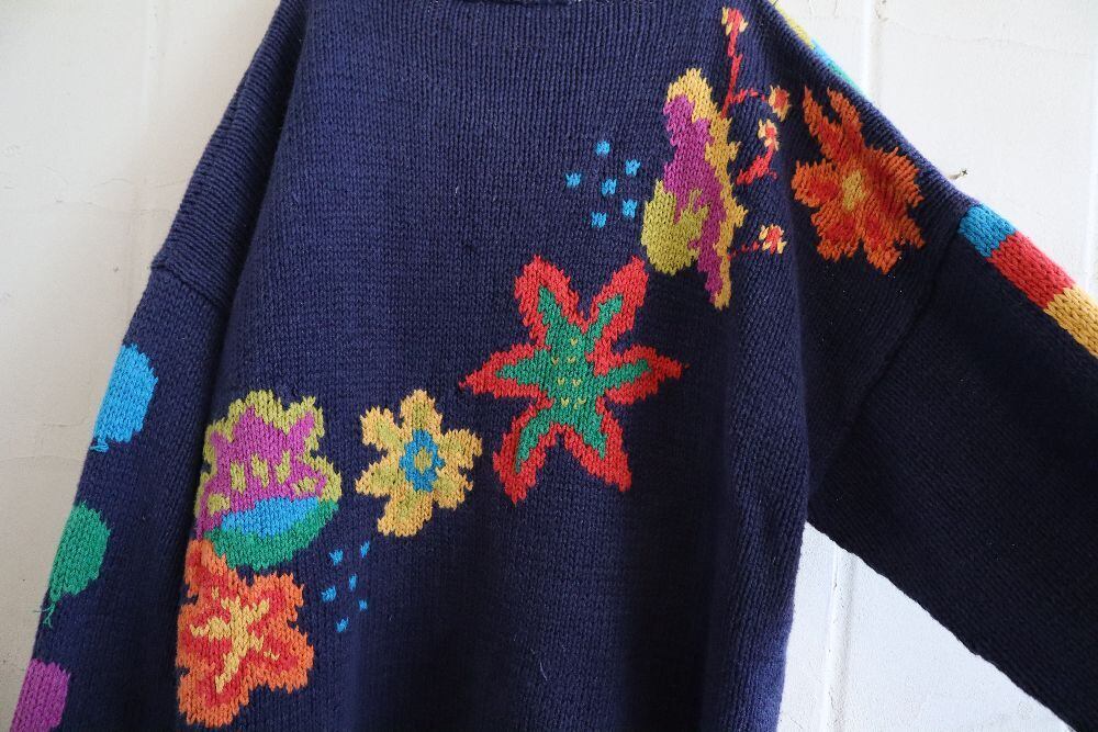 ネイビーにポップなカラーリングや様々な種類のお花が可愛いコットンニットプルオーバー。