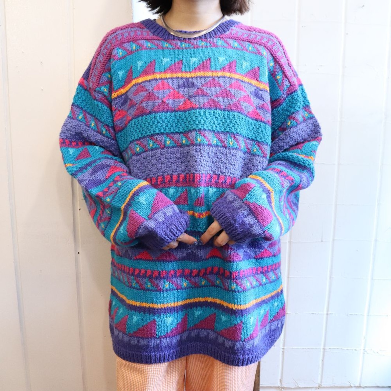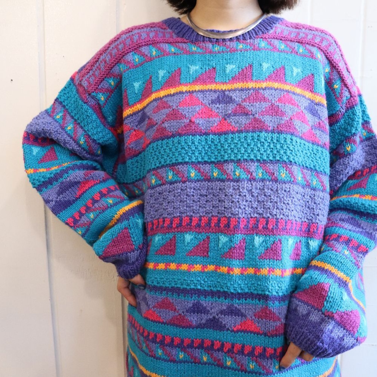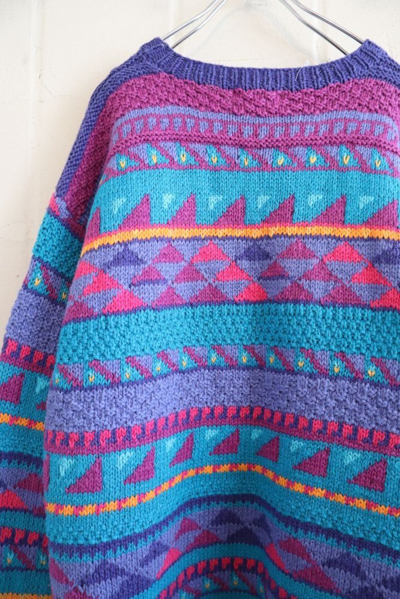 "L.L.Bean" purple× blue green geometric cotton knit pullover [l-1374]