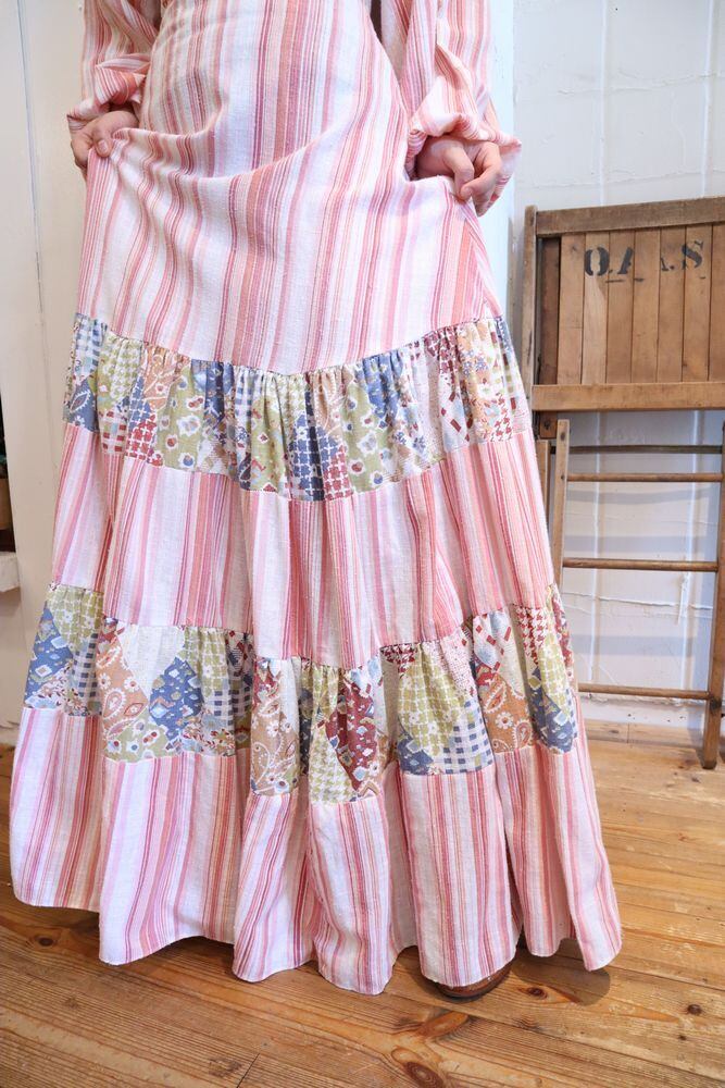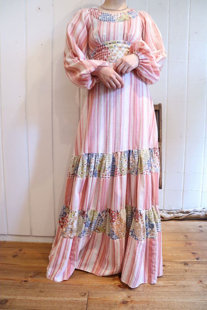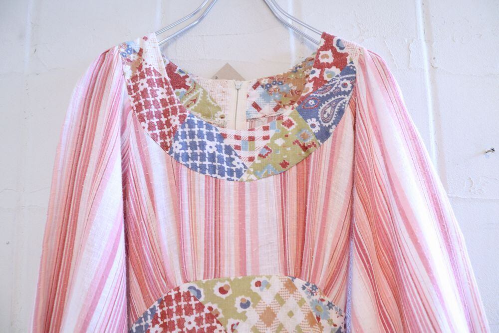 70s pink×white patchwork pattern tiered dress [l-40277]
