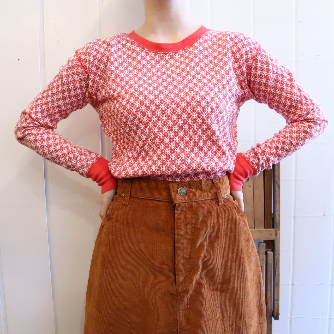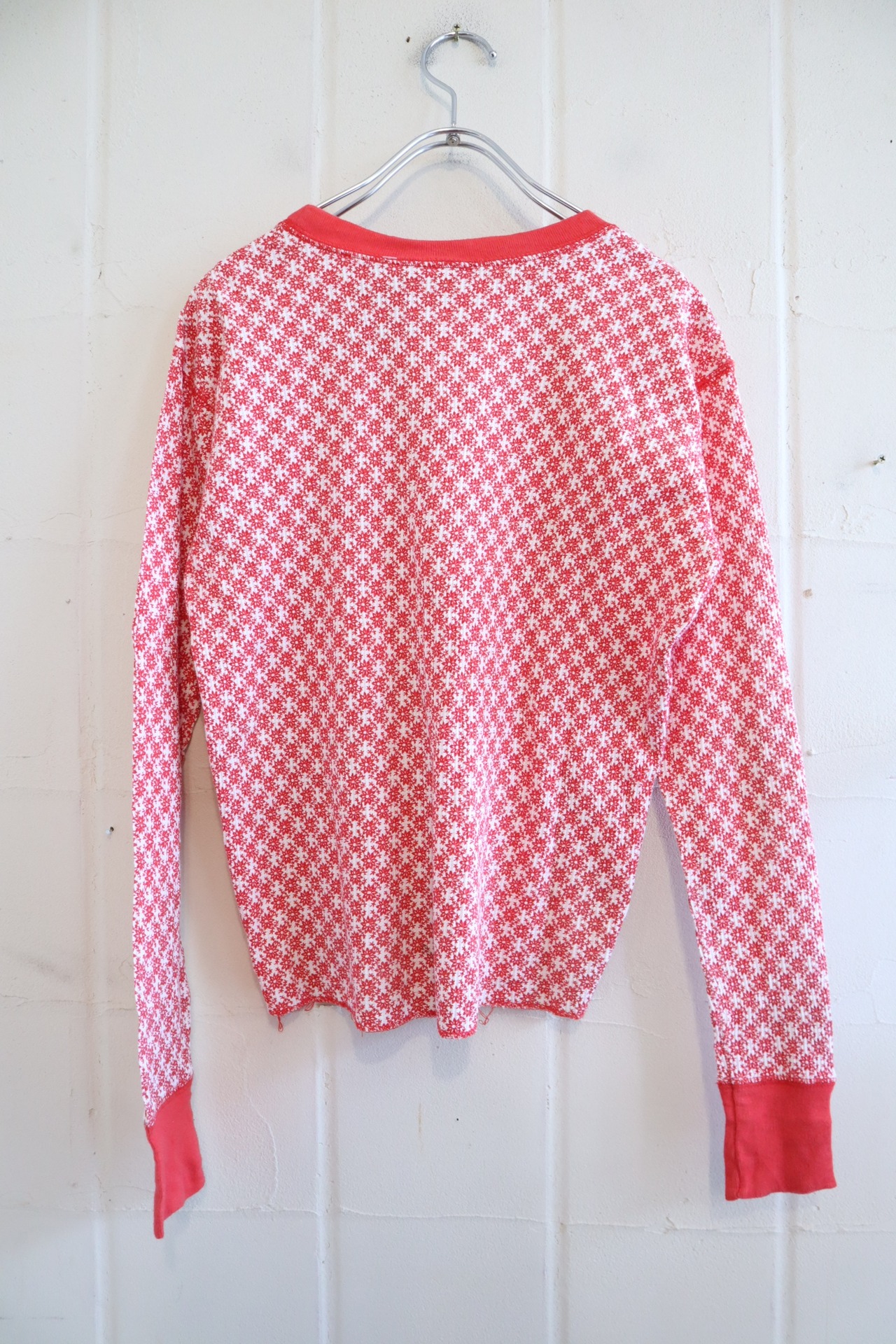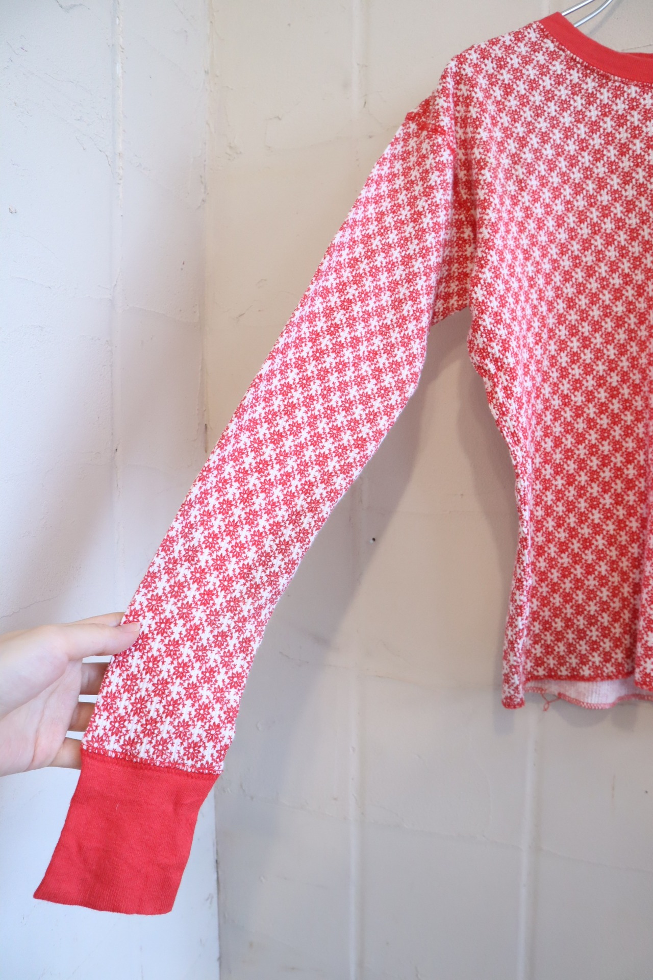 レッドカラーと花柄が可愛いサーマルトップス♡