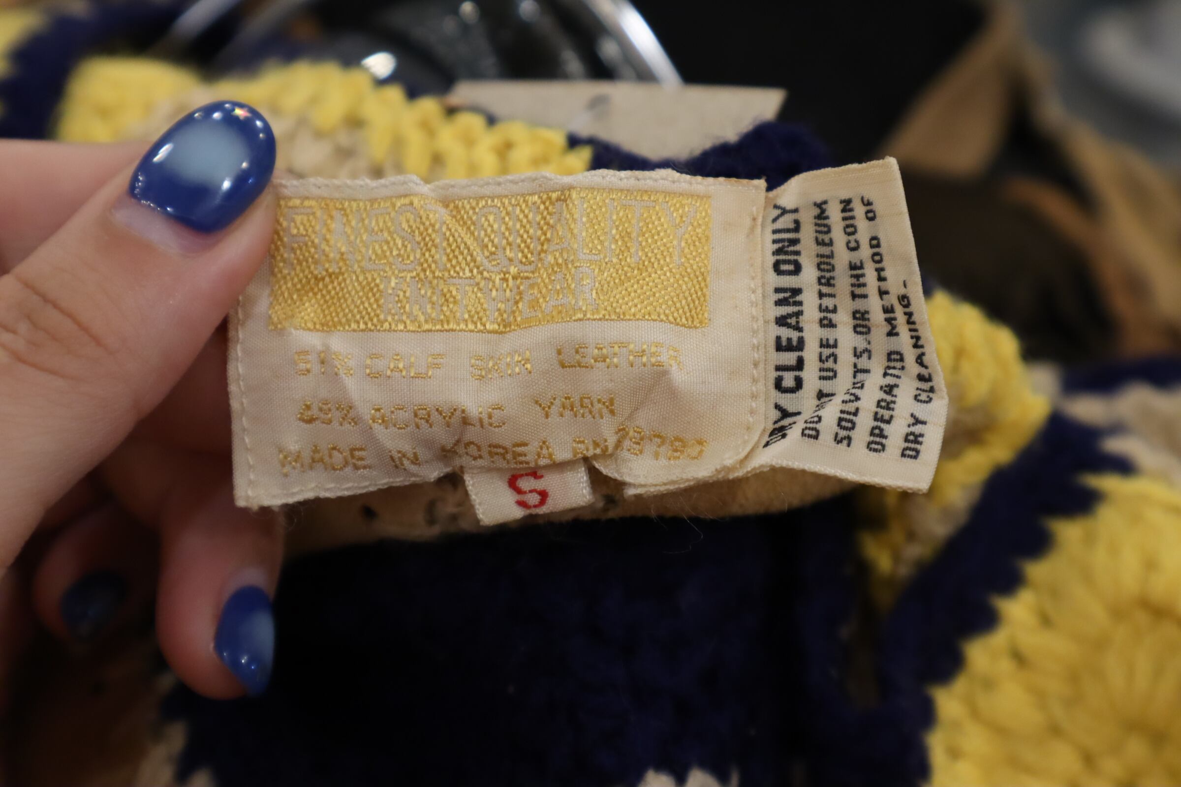 ニット部分にいくつか糸の飛び出し、ボタンにやや錆び、いくつかシミ汚れ、一部何か付着したような汚れがございますが、古着の味として着て頂けるかと思われます。