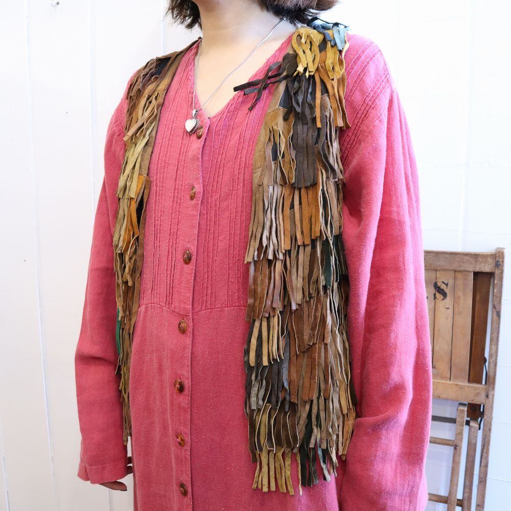 ブラウンベースにグリーンやイエローがアクセントになっていて可愛いレザーベスト。