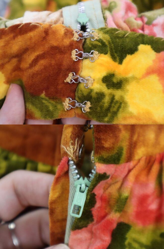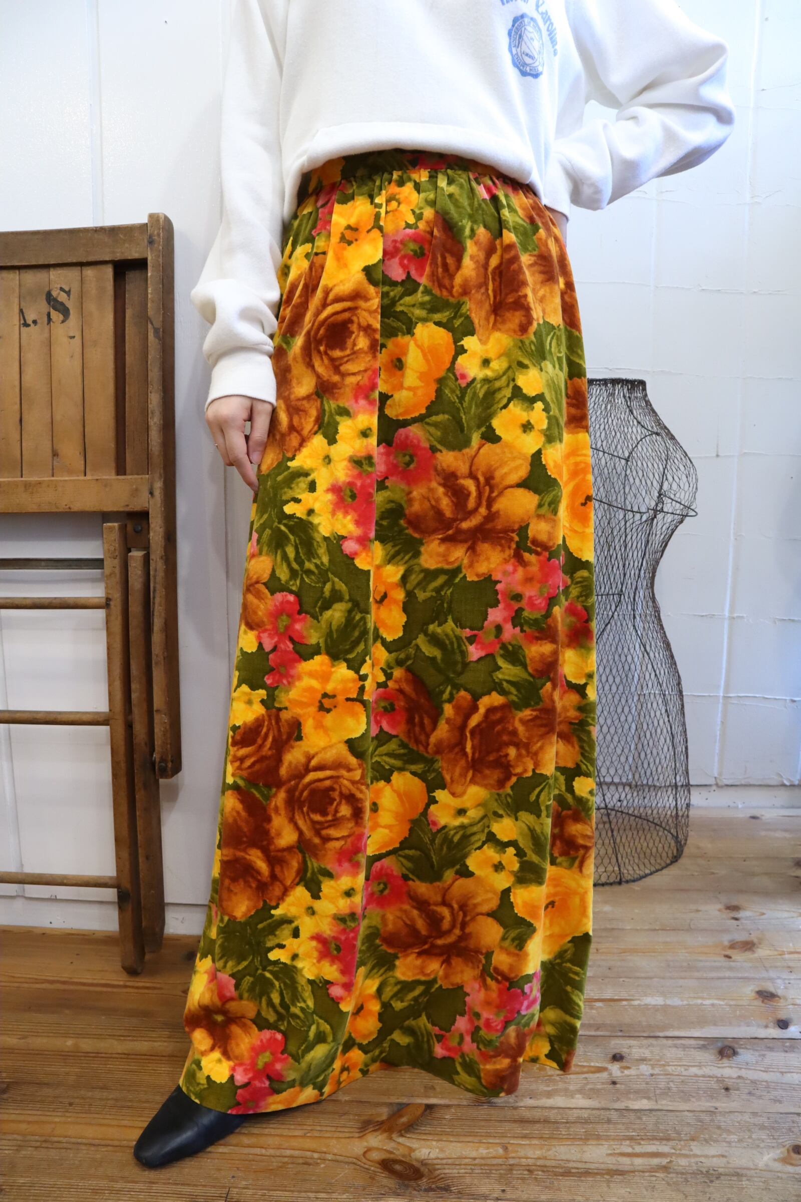 70s mossgreen×yellow flower velour skirt [l-1458]